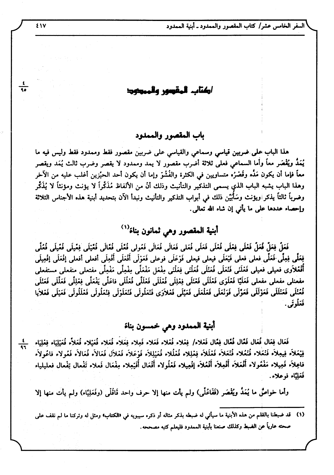 هَذَا الْبَاب على ضَرْبَيْنِ: قياسي وسماعي، والقياسي على ضَرْبَيْنِ: مَقْصُور فَقَط وممدود فَقَط وَلَيْسَ فِيهِ مَا يُمَدُّ ويُقْصَر مَعًا، وَأما السماعي فعلى ثَلَاثَة أضْرب: مَقْصُور لَا يمد وممدود لَا يقصر وَضرب ثَالِث يُمَد ويُقصَر مَعًا. فإمَّا أَن يكون مَدُّه وقَصْرُه متساويين فِي الْكَثْرَة والفُشُوّ وَإِمَّا أَن يكون أحد الحيِّزَيْن أغلب عَلَيْهِ من الآخر وَهَذَا الْبَاب يشبه الْبَاب الَّذِي يُسمى التَّذْكِير والتأنيث وَذَلِكَ أنّ من الْأَلْفَاظ مُذكَّراً لَا يؤنث ومؤنثاً لَا يُذَكَّر وَضَربا ثَالِثا يذكر وَيُؤَنث وسأُبيِّن ذَلِك فِي أَبْوَاب التَّذْكِير والتأنيث ونبدأ الْآن بتحديد أبنية هَذِه الْأَجْنَاس الثَّلَاثَة وإحصاء عَددهَا على مَا يَأْتِي إِن شَاءَ الله تَعَالَى.