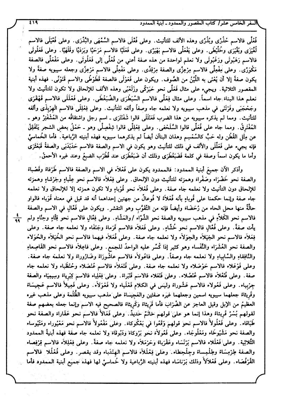فَعَلَى فالاسم خَوْزَلَى. وعَلى فَعالَى فالاسم خَزازَى وَالصّفة كَسالَى وَلَا نعلمهُ جَاءَ صفة فِي الْوَاحِد وكلُّ هَذِه الْأَبْنِيَة يشْتَرك فِيهَا الْمَقْصُور والممدود. وعَلى فِعِلَّى فالاسم الجِرِشَّى والعِبِدَّى وَالصّفة الكِمِرَّى وإنَّه لَحِنِفَّى العُنُق. وعَلى فِعِّيلَى نَحْو هِجِّيرَى وحِثِّيْثَى وقِتِّيتَى مصَادر وَلم تأت وَصفا وَلَا اسْما وَهَذَانِ البناآن فِعِّيلَى وفِعِلَّى يشْتَرك فيهمَا الْمَقْصُور فَقَط وَمَا يمد وَيقصر مَعًا فالمقصور كَمَا أريتك من هِجِّيرَى وجِرِشَّى، وَأما مَا يُمَدُّ ويُقْصَر فخِصِّيصَى وزِمِكَّى الطّائر وزِمِجّاه وَهَذَانِ البناآن للتأنيث. وعَلى فُعَّالَى فالاسم شُقَّارَى وخُضَّارَى وحُوَّارَى وَلم يَأْتِ صفة. وعَلى فُعالَى فالاسم رُخامَى وزُبانَى وَالصّفة سُكارَى وعُجالَى وَهَاتَانِ الألفان للتأنيث. وعَلى فَعَنْلَى فالاسم القَرَنْبَى وَالْوَصْف حَبَنْطىً وسَرَنْدىً وسَبَنْدىً فَأَما عَلَنْدىً فقد يكون اسْما وَصفَة وَمذهب سِيبَوَيْهٍ أَنه اسْم أَلا ترَاهُ قَالَ فالاسم القَرَنْبَى والعَلَنْدَى. وعَلى فَعَلْنَى فالصفة عَفَرْنىً وجَمَلٌ عَلَدْنىً وَقَالُوا عُلادَى مثل حُبارى. وعَلى فُعُنْلَى نَحْو عُلُنْدىً وَلَيْسَ فِي الْكَلَام فِعُنْلَى وَلَا فِعِنْلَى وكل هَذِه الألفات للإلحاق. وعَلى فِعِلْنَى فالاسم العِرِضْنَى. وعَلى فُعَلَّى فالاسم العُرَضَّى. وعَلى فُعَنْلَى فالاسم جُلَنْدَى وكل هَذِه الألفات للتأنيث. وعَلى فَيْعَلَى فالاسم خَيْزَلَى ودَيْسَكَى وَلَيْسَ فِي الْكَلَام فَعِنْلَى وَلَا فَعُلَّى. وعَلى فُعُلَّى فالاسم حُذُرَّى وبُذُرَّى وَهَذِه الْألف للتأنيث. وعَلى فُعَّلَى فالاسم السُّمَّهَى والبُدَّرَى. وعَلى فُعَّيْلَى فالاسم لُغَّيْزى وبُقَّيْرَى وخُلَّيْطَى. وعَلى يَفْعَلَّى فالاسم بَهْيَرَّى. وعَلى فَعَلَيَّا فالاسم مَرَحَيّا وبَرَدَيّا وقَلَهَيّا، وعَلى فَعَلُوتَى فالاسم رَهَبُوتَى ورَغَبُوتَى وَلَا نعلم لوَاحِدَة من هَذِه صفة، أَعنِي من فُعُلَّى إِلَى فَعَلُوتَى. وعَلى مَفْعَلَّى فالصفة مَكْوَرَّى. وعَلى مِفْعِلَّى فالاسم مِرْعِزَّى وَالصّفة مِرْقِدَّى. وعَلى مَفْعِلَّى فالاسم مَرْعِزَّى وَجعله سِيبَوَيْهٍ صفة، وَلَا يكون صفة إِلَّا أَن يُعْنَى بِهِ الَّليّنُ من الصُّوف. وَيكون على فَعَوْلَى فالصفة قَطَوْطىً وَالِاسْم قَنَوْنَى. فَهَذِهِ أبنية الْمَقْصُور الثلاثية. وَيَجِيء على مِثَال فَعَلَّى نَحْو حَبَرْكَىً وزَلَعْبىً وَهَذِه الْألف للإلحاق وَلَا تكون للتأنيث وَلَا نعلم هَذَا الْبناء جَاءَ اسْما. وعَلى مِثَال فِعَلَّى فالاسم السِّبَطْرَى والضِّبَغْطَى. وعَلى فَعْلَلى فالاسم قَهْقَرى وجَحْجَبَى وفَرْتَنَى فِي مَذْهَب سِيبَوَيْهٍ وَلَا نعلمهُ جَاءَ وَصفا وألفه للتأنيث. وعَلى فِعْلِلَى فالاسم الهِرْبِذى وألفه للتأنيث. وَمِمَّا لم يذكرهُ سِيبَوَيْهٍ من هَذَا الضَّرْب فَعَنْلَلى قَالُوا شَفَنْتَرَى: اسْم رجل واشتقاقه من المُشْفَتِّرِ وَهُوَ: المفتَرِقُ. وَمِمَّا جَاءَ على فُعَلَّى قَالُوا السُّلَحْفى. وعَلى فِعَلِلَّى قَالُوا شِفْصِلَّى وَهُوَ: حمل بعض الشّجر ينفلق عَن مثل الْقطن وَله حَبٌّ كالسمسم، وَهَذَانِ البناآن لم يذكرهما سِيبَوَيْهٍ فَهَذِهِ أبنيته الرّبَاعِيّة. فَأَما الخُماسيّ فَإِنَّهُ يَجِيء على فَعَلَّلَى وَالْألف فِي ذَلِك للتأنيث وَهُوَ يكون فِي الِاسْم وَالصّفة فالاسم حَدَبْدَبَى وَالصّفة قَبَعْثَرَى، وَأما مَا يكون اسْما وَصفَة فِي كلمة فضَبَغْطَرَى وَذَلِكَ أَن ضَبَغْطَرى عِنْد قُطْرُب الضبعُ وَعند غَيره الأحمق. وأذكر الْآن جَمِيع أبنية الْمَمْدُود. فالممدود يكون على فَعْلاء فِي الِاسْم وَالصّفة، فالاسم طَرْفاءُ وقَصْباءُ، وَالصّفة نَحْو خَضْراء وصَفْراء وهمزته للتأنيث دون الْإِلْحَاق. وعَلى فِعْلاء 