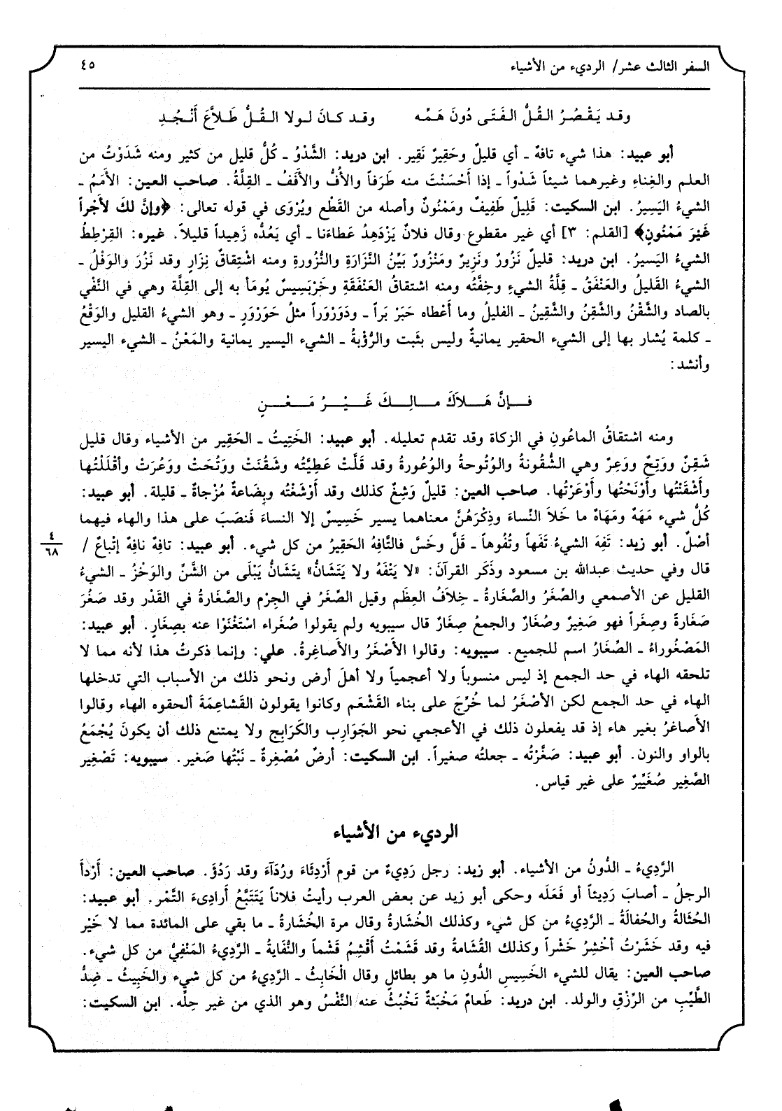 وَقد يقْصُرُ القُلُّ الْفَتى دون همّه وَقد كَانَ لَوْلَا القُلُّ طَلاّعَ أنْجُدِ أَبُو عُبَيْد: هَذَا شَيْء تافِه: أَي قَلِيل وحَقير نَقير. ابْن دُرَيْد: الشّدْو: كل قَلِيل من كثير وَمِنْه شَدَوْت من الْعلم والغناء وَغَيرهمَا شَيْئا شَدْواً: إِذا أَحْسَنت مِنْهُ طرفا. والأُفّ والأفّف: القِلَّة. صَاحب الْعين: الأمَم: الشّيء الْيَسِير. ابْن السّكيت: قَلِيل طَفيف ومَمنون وَأَصله من القَطْع ويُروى فِي قَوْله تَعَالَى: (وإنّ لَك لأجراً غير مَمْنون) . أَي غير مَقْطُوع، وَقَالَ: فلَان يَزْدَهِد عطاءنا: أَي يعدّه زَهيداً قَلِيلا. غَيره: القِرْطِط: الشّيء الْيَسِير. ابْن دُرَيْد: قليلٌ نَزورٌ ونَزير ومَنْزور بيِّن النّزارة والنّزورة وَمِنْه اشتقاق نِزار وَقد نَزُر، والوَفْل: الشّيء الْقَلِيل، والعَنْفَق: قلَّة الشّيء وخفّته، وَمِنْه اشتقاق العَنْفَقَة، وخَرْبَسيس يومأ بِهِ إِلَى الْقلَّة وَهِي فِي النّفي بالصَّاد، والشّقْن والشّقِن والشّقين: الْقَلِيل وَمَا أعطَاهُ حَبَرْبَرَاً _ ودَوَرْوَراً مثل حَوَرْوَر _ وَهُوَ الشّيء الْقَلِيل، والوَقْع: كلمة يُشار بهَا إِلَى الشّيء الحقير يَمَانِية وَلَيْسَ بثبت والرُّؤْبة: الشّيء الْيَسِير، يَمَانِية، والمَعْن: الشّيء الْيَسِير، وَأنْشد: فإنَّ هَلاكَ مالِكَ غيرُ مَعْنٍ وَمِنْه اشتقاق الماعون فِي الزّكاة وَقد تقدم تَعْلِيله. أَبُو عُبَيْد: الخَتيت: الحقير من الْأَشْيَاء، وَقَالَ: قَلِيل شَقِن ووَتِح ووَعِر وَهِي الشّقونة والوُتوحة والوُعورة، وَقد قلّت عَطِيَّته وشَقُنَت ووَتَحَت ووَعُرَت وأقللتها وأشقَنتها وأوتحتها وأوعرتها. صَاحب الْعين: قَلِيل وَشِغ كَذَلِك وَقد أوشَغته، وبضاعة مُزْجاة: قَليلَة. أَبُو عُبَيْد: كل شَيْء مَهَه ومَهاهٌ مَا خلا النّساء وذِكرهنّ مَعْنَاهُمَا يسير خَسيس إلاّ النّساء فَنَصَب على هَذَا وَالْهَاء فيهمَا أصل. أَبُو زيد: تَفِه الشّيء تَفَهاً وتُفوهاً: قلّ وخَسّ فالتّافِه الحقير من كل شَيْء. أَبُو عُبَيْد: تافِه نافِه اتْباعٌ. قَالَ: وَفِي حَدِيث عبد الله بن مَسْعُود وذَكَر الْقُرْآن: لَا يَتْفَه وَلَا يَتَشانُّ. يتشانّ: يبْلى من الشّنِّ، والوَخْز: الشّيء الْقَلِيل عَن الْأَصْمَعِي والصِّغَر والصَّغارة: خلاف العِظَم وَقيل الصِّغَر فِي الجِرم والصَّغارة فِي القدْر وَقد صَغُر صَغارَةً وصِغْراً فَهُوَ صَغير وصُغار وَالْجمع صِغار. قَالَ سِيبَوَيْهٍ: وَلم يَقُولُوا صُغَراء استغنوا عَنهُ بصِغار. أَبُو عُبَيْد: المَصْغوراء: الصِّغار اسْم للْجَمِيع. سِيبَوَيْهٍ: وَقَالُوا الْأَصْغَر والأصاغِرَة. على. وَإِنَّمَا ذكرت هَذَا لِأَنَّهُ مِمَّا لَا تلْحقهُ الْهَاء فِي حد الْجمع إِذْ لَيْسَ مَنْسُوبا وَلَا أعجمياً وَلَا أهل أَرض وَنَحْو ذَلِك من الْأَسْبَاب التّي تدْخلهَا الْهَاء فِي حد الْجمع لَكِن الْأَصْغَر لما خُرِّج على بِنَاء القَشْعَم وَكَانُوا يَقُولُونَ القَشاعِمَة ألحقوه الْهَاء وَقَالُوا الأصاغر بِغَيْر هَاء إِذْ قد يَفْعَلُونَ ذَلِك فِي الأعجمي نَحْو الجَوارِب والكَرابِج وَلَا يمْتَنع ذَلِك أَن يكون يُجمع بِالْوَاو والنّون. أَبُو عُبَيْد: صَغَّرْته: جعلته صَغِيرا. ابْن السّكيت: أرضٌ مُصْغِرَة: نبتها صَغِير. سِيبَوَيْهٍ: تَصْغِير الصَّغِير صُغَيِّير على غير قِيَاس.