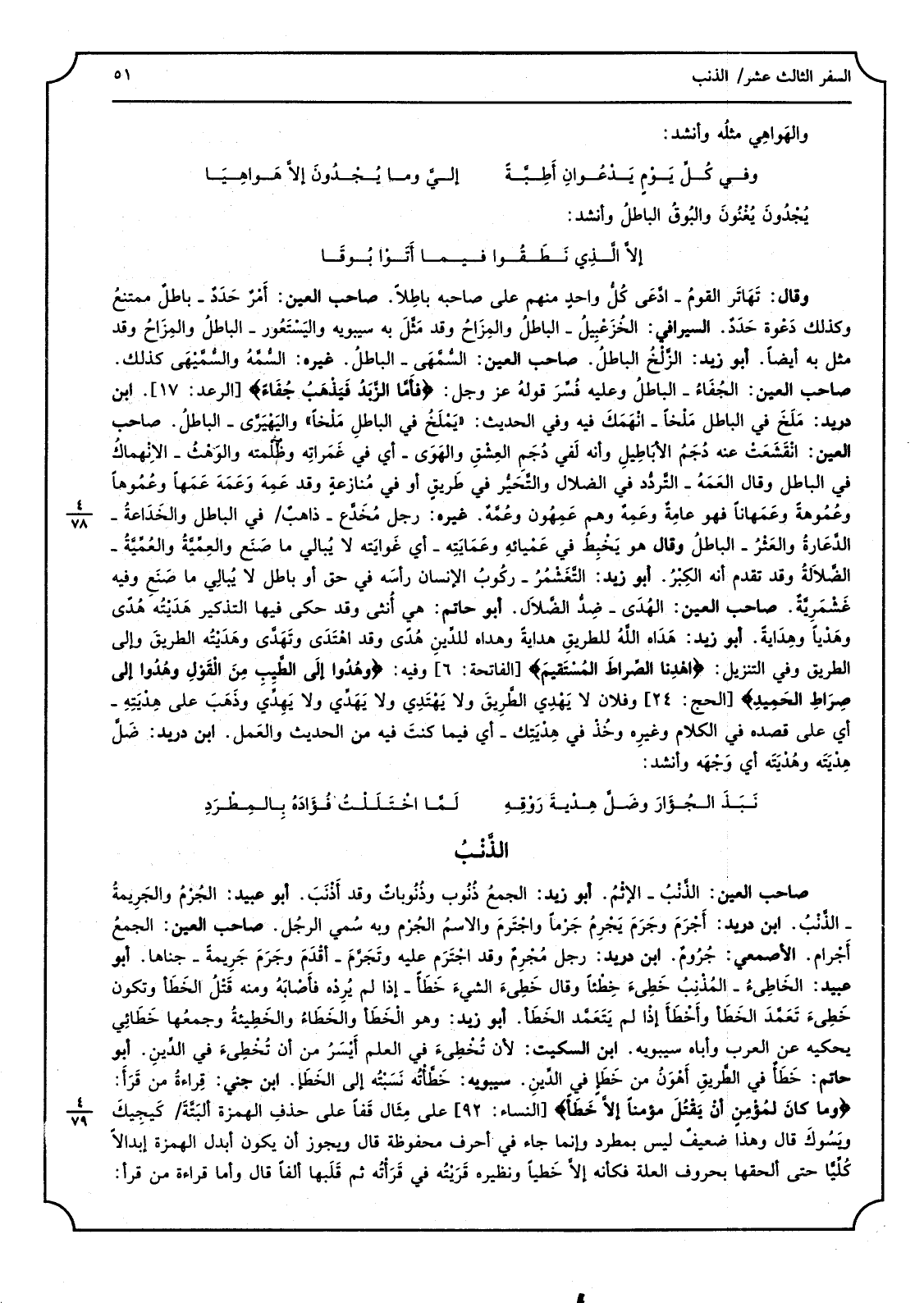 صَاحب الْعين: الذَّنْب: الإِثم. أَبُو زيد: الْجمع ذُنوب وذُنوبات وَقد أذْنَب. أَبُو عُبَيْد: الجُرْم والجَريمة: الذَّنب. ابْن دُرَيْد: أجرم وجَرَم يجْرِم جُرماً واجترم وَالِاسْم الجُرْم وَبِه سُمي الرّجل. صَاحب الْعين: الْجمع أجْرام. الْأَصْمَعِي: جُروم. ابْن دُرَيْد: رجل مُجْرِم وَقد اجتَرَم عَلَيْهِ وتَجَرَّم: أقدمَ. وجَرَمَ جَريمةً: جناها. أَبُو عُبَيْد: الخاطِئ: المُذنب، خَطِئ خِطْئاً وَقَالَ: خَطِئ الشّيء خَطَأ: إِذا لم يُرده فَأَصَابَهُ وَمِنْه قتل الْخَطَأ وَتَكون خَطِئ تعمّد الْخَطَأ وَأَخْطَأ إِذا لم يتَعَمَّد الْخَطَأ. أَبُو زيد: وَهُوَ الْخَطَأ والخَطاء والخَطيئة وَجَمعهَا خَطائي يحكيه عَن الرّعب وأباه سِيبَوَيْهٍ. ابْن السّكيت: لِأَن تُخْطِئ فِي الْعلم أَهْون من خَطأٍ فِي الَّذين. سِيبَوَيْهٍ: خَطَّأته: نسبته إِلَى الخطا. ابْن جني: قِرَاءَة من قَرَأَ: (وَمَا كَانَ لمُؤْمِن أَن يقتل مُؤمنا إلاّ خَطأ) . على مِثَال قَفا على حذف الْهمزَة البتّة كيَجيك ويَسوك، قَالَ: وَهَذَا ضَعِيف لَيْسَ بمطرد وَإِنَّمَا جَاءَ فِي أحرف مَحْفُوظَة. قَالَ: وَيجوز أَن يكون أبدل الْهمزَة إبدالاً كلياً حَتَّى ألحقها بحروف الْعلَّة فَكَأَنَّهُ إلاّ خطياً وَنَظِيره قَرَيْته فِي قرأته ثمَّ قَلبهَا ألفا قَالَ: وَأما قِرَاءَة من قَرَأَ: