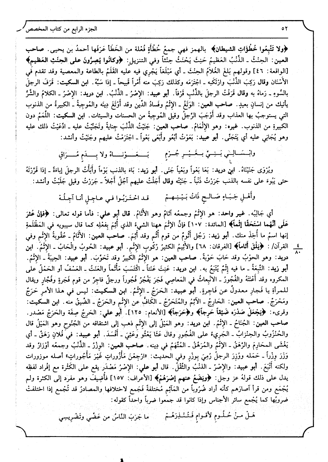 (وَلَا تتبعوا خطؤات الشّيطان) . بِالْهَمْز فِي جمع خُطاة فعله من الْخَطَأ عرفهَا أَحْمد بن يحيى. صَاحب الْعين: الحِنْث: الذَّنب الْعَظِيم حَنِث يحنَث حنثاً وَفِي التّنزيل: (وَكَانُوا يصرون على الحِنْث الْعَظِيم) وَقَوْلهمْ بلغ الْغُلَام الحِنْث: أَي مبلغا يجْرِي فِيهِ عَلَيْهِ الْقَلَم بالطّاعة وَالْمَعْصِيَة وَقد تقدم فِي الْأَسْنَان وَقَالَ ركب الذَّنْب وارتكبه: اجترمه وَكَذَلِكَ ركب مِنْهُ أمرا قبيحاً: إِذا سبَّه. ابْن السّكيت: قَرَف الرَّجُل بالسّوء: رَمَاه بِهِ وَقَالَ: قَرَفْت الرَّجُل بالذنب قَرْفاً. أَبُو عُبَيْد: الإِصْر: الذَّنب. ابْن دُرَيْد: الإِصر: الْكَلَام والشّر يَأْتِيك من إِنْسَان بعيد. صَاحب الْعين: الوَتَغ: الإِثم وَفَسَاد الدّين وَقد أوْتَغ دينه، والمُوجِبَة: الْكَبِيرَة من الذُّنُوب التّي يسْتَوْجب بهَا الْعَذَاب وَقد أوجب الرَّجُل وَقيل الموجِبة من الْحَسَنَات والسّيئات. ابْن السّكيت: اللَّمَم دون الْكَبِيرَة من الذُّنُوب. غَيره: وَهُوَ الإِلمام. صَاحب الْعين: جَنَيْت الذَّنب جِناية وتَجنَّيْت عَلَيْهِ: ادَّعيت ذَلِك عَلَيْهِ وَهُوَ يُجاني عَلَيْهِ أَي يتجنّى. أَبُو عُبَيْد: بَعَوْت أبْعو وأبْعي بَعْواً: اجترمت عَلَيْهِم وجنيت وَأنْشد: وإبسالي بنيَّ بِغَيْر جُرْمٍ بَعَوْناه وَلَا بدمٍ مُراقِ ويُروى جَنيناه. ابْن دُرَيْد: بَعا بَعْواً وبَعْياً: جنى. أَبُو زيد: بَاء بالذنب بَوءاً وأبات الرَّجُل إباءة: إِذا قَرّرته حَتَّى يبوء على نَفسه بالذنب. جَرَرْت ذَنبا: جنيته، وَقَالَ: أَجَلْت عَلَيْهِم آجل أَََجَلًا: جررت، وَقيل جَلَبْت، وَأنْشد: وأهلِ خِباءٍ صالحٍ ذَات بَينهم قد احتربوا فِي عاجلٍ أَنا آجِلهُ أَي جالبه. غير وَاحِد: هُوَ الإِثم وَجمعه آثام وَهُوَ الإِثام. قَالَ أَبُو عَليّ: فَأَما قَوْله تَعَالَى: (فإنْ عُثر على أَنَّهُمَا استحقا إثْماً) . فَإِن الإِثم هَهُنَا الشّيء الَّذِي أُثِم بِفِعْلِهِ كَمَا قَالَ سِيبَوَيْهٍ فِي المَظْلَمة أَنَّهَا اسْم مَا أُخذ مِنْك. أَبُو زيد: رجل أَثْوَم من قوم أُثُم وَقد أَثِم. صَاحب الْعين: الإِثام: عُقُوبَة الإِثم وَفِي الْقُرْآن: (يلقَ أثاما) . والأثيم الْكثير ركُوب الإِثم. أَبُو عُبَيْد: الحُوب والحاب: الإِثم. ابْن دُرَيْد: وَهُوَ الحَوْب وَقد حاب حَوْبَةً. صَاحب الْعين: هُوَ الإِثم الْكَبِير وَقد تَحَوَّب. أَبُو عُبَيْد: الحِيبة: الإِثم. أَبُو زيد: التّبِعَة: مَا فِيهِ إِثْم يُتبع بِهِ. ابْن دُرَيْد: عَنِت عَنَتَاً: اكْتسب مأثماً، والعَنَت: العَسف أَو الْحمل على الْمَكْرُوه وَقد أعْنَتَه والفُجور: الانبعاث فِي الْمعاصِي، فَجَر يفجُر فُجوراً وَرجل فَاجر من قوم فَجَرَة وفُجَّار وَيُقَال للْمَرْأَة يَا فَجار معدول عَن فاجرة. أَبُو عُبَيْد: الحَرَج: الإِثم. ابْن السّكيت: لَيْسَ فِي هَذَا الْأَمر حَرَج ومَحرَج. صَاحب الْعين: الحارِج: الإِثم والمُتَحَرِّج: الكافُّ عَن الإِثم. والحرج: الضّيق مِنْهُ. ابْن السّكيت: وقُرئ: (يَجْعَل صَدره ضيقا حَرِجاً وحَرَجاً) . أَبُو عَليّ: الحَرِج صفة والحرَج مصدر. صَاحب الْعين: الجُناح: الإِثم. ابْن دُرَيْد: وَهُوَ الْميل إِلَى الإِثم ذهب إِلَى اشتقاقه من الجُنوح وَهُوَ الْميل قَالَ والحُنْزوب والحِنْزاب: الجريء على الْفُجُور وَقَالَ: عثا يعثو وعَثِي: أفسد. أَبُو عُبَيْد: فِي فلَان رَهَق: أَي يغشى الْمَحَارِم. والرَّهَق: الإِثم. والمُرَهَّق: المتَّهَم فِي دينه. صَاحب الْعين: الوِزْر: الذَّنب وَجمعه أوزار وَقد وَزَر وِزْراً: حمله ووُزِر الرَّجُل رُمي بوزر وَفِي الحَدِيث: (ارجِعن مَأْزُورَات غير مَأْجُورَات) . أَصله موزورات وَلكنه أتبع. أَبُو عُبَيْد: والإصْر: الذَّنب والثّقل. قَالَ أَبُو عَليّ: الإِصر مصدر يَقع على الْكَثْرَة مَعَ إِفْرَاد لَفظه يدل على ذَلِك قَوْله عز وَجل: (وَيَضَع عَنْهُم إصْرَهم) . فأُضيف وَهُوَ مُفْرد إِلَى الْكَثْرَة وَلم يُجمع وَم