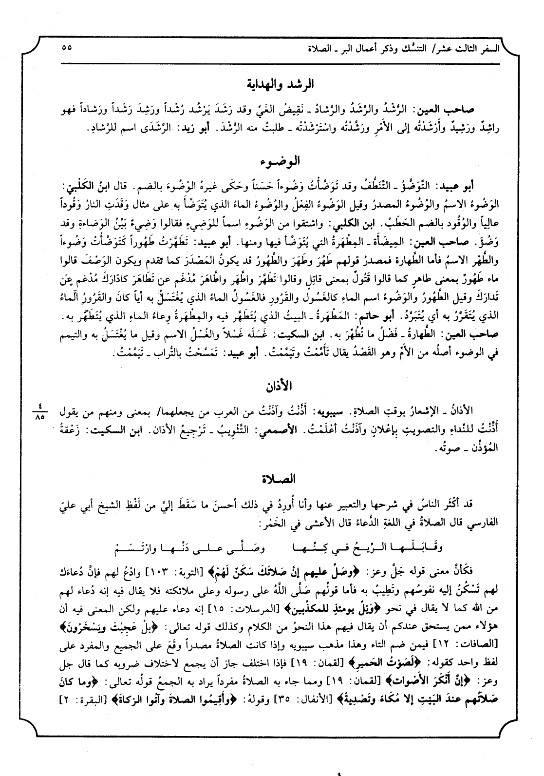 قد أَكثر النّاس فِي شرحها والتّعبير عَنْهَا وَأَنا أورد فِي ذَلِك أحسن مَا سقط إِلَيّ من لفظ الشّيخ أبي عَليّ الْفَارِسِي، قَالَ: الصَّلَاة فِي اللُّغَة الدّعاء، قَالَ الْأَعْشَى فِي الْخمر: وقابَلها الرّيحُ فِي كِنِّها وصلّى على دَنِّها وارتسمْ فَكَانَ معنى قَوْله عز وَجل: (وصلِّ عَلَيْهِم إِن صَلَاتك سَكنٌ لَهُم) . وادع لَهُم فَإِن دعاءك لَهُم تسكن إِلَيْهِ نُفُوسهم وتطيب بِهِ فإمَّا قَوْلهم صلّى الله على رَسُوله وعَلى مَلَائكَته فَلَا يُقَال فِيهِ إِنَّه دُعَاء لَهُم من الله كَمَا لَا يُقَال فِي نَحْو وَيْل للمكذبين أَنه دُعَاء عَلَيْهِم وَلَكِن الْمَعْنى فِيهِ أَن هَؤُلَاءِ مِمَّن يسْتَحق عنْدكُمْ أَن يُقَال فيهم هَذَا النّحو من الْكَلَام، وَكَذَلِكَ قَوْله تَعَالَى: (بل عَجِبْتَ ويسخرون) . فِيمَن ضم التّاء وَهَذَا مَذْهَب سِيبَوَيْهٍ وَإِذا كَانَت الصَّلَاة مصدرا وَقع على الْجَمِيع والمفرد على لفظ وَاحِد كَقَوْلِه: (لصوت الْحمير) فَإِذا اخْتلف جَازَ أَن يجمع لاخْتِلَاف ضروبه كَمَا قَالَ عز وَجل: (إِن أنكر الْأَصْوَات) وَمِمَّا جَاءَ بِهِ الصَّلَاة مُفردا يُرَاد بِهِ الْجمع قَوْله تَعَالَى: (وَمَا كَانَ صلَاتهم عِنْد الْمَسْجِد الْحَرَام إلاّ مُكاءً وتصديةً) . وَقَوله: (وَأقِيمُوا الصَّلَاة وَآتوا الزّكاة)