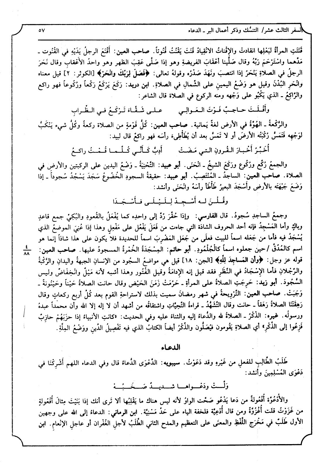 قَنَتَتِ الْمَرْأَة لبعلها انقادت والإقنات الانقياد، قَنَت يقنُت قُنوتاً. صَاحب الْعين: أقنع الرَّجُل يَدَيْهِ فِي القُنوت: مدهما واسترحم ربه وَقَالَ: صلينَا أعْقاب الْفَرِيضَة وَهُوَ إِذا صلى عقب الظّهر وَهُوَ وَاحِد الأعقاب وَقَالَ نحر الرَّجُل فِي الصَّلَاة ينحَر إِذا انتصب ونَهد صَدره وَقَوله تَعَالَى: (فصلِّ لِرَبِّك وانحر) . قيل مَعْنَاهُ وانحر البُدْن وَقيل هُوَ وضع الْيَمين على الشّمال فِي الصَّلَاة. ابْن دُرَيْد: ركَع يركَع رَكْعاً ورُكوعاً فَهُوَ رَاكِع والراكع: الَّذِي يكبو على وَجهه وَمِنْه الرّكوع فِي الصَّلَاة، قَالَ الشّاعر: وأفلتَ حاجبٌ فَوْتَ العوالي على شَقَّاءَ تركعُ فِي الظّرابِ والرُّكْعَة: الهُوَّة فِي الأَرْض لُغَة يَمَانِية. صَاحب الْعين: كل قَوْمَة من الصَّلَاة رَكْعَة وكل شَيْء ينكبُّ لوجهه فتمَسُّ رُكبته الأَرْض أَو لَا تمس بعد أَن يُطأطئ رَأسه فَهُوَ رَاكِع، قَالَ لبيد: أُخَبِّرُ أَخْبَار الْقُرُون التّي مَضَت أَدِبُّ كَأَنِّي كلما قُمت راكعُ وَالْجمع رُكَّع ورُكوع ورَكَع الشّيخ: انحنى. أَبُو عُبَيْد: التّحْنِيَة: وضع الْيَدَيْنِ على الرّكبتين وَالْأَرْض فِي الصَّلَاة. صَاحب الْعين: السّاجد: المنتصب. أَبُو عُبَيْد: حَقِيقَة السّجود الخضوع، سَجَد يسجُد سُجوداً: إِذا وضع جَبهته بِالْأَرْضِ وأسجَد الْبَعِير طأطأ رَأسه وانحنى وَأنْشد: وقُلن لَهُ أسْجِد ليلى فأسجَدا وَجمع السّاجد سُجود. قَالَ الْفَارِسِي: وَإِذا حُقِّر رُدّ إِلَى واحده كَمَا يُفعل بالقُعود والبُكِيّ جمع قَاعد وَبَاكٍ وَأما المَسْجِد فَإِنَّهُ أحد الْحُرُوف الشّاذة التّي جَاءَت من فَعَلَ يفْعُل على مَفْعِل وَهَذَا إِذا عُني الْموضع الَّذِي يُسجَد فِيهِ فَأَما من جعله اسْما للبيت فعلى من جعل المَضْرِب اسْما للحديدة فَلَا يكون على هَذَا شاذاً إِنَّمَا هُوَ اسْم كالمُدِقِّ حِين جَعَلُوهُ اسْما كالجُلمود. أَبُو حَاتِم: المِسْجَدَة: الخُمرة المَسجود عَلَيْهَا. صَاحب الْعين: قَوْله عز وَجل: (وَأَن الْمَسَاجِد لله) قيل هِيَ مَوَاضِع السّجود من الإِنسان الْجَبْهَة وَالْيَدَانِ وَالركبَة وَالرجلَانِ فَأَما الإِسجاد فِي النّظر فقد قيل إِنَّه الإِدامة وَقيل الفُتور وَهَذَا أشبه لِأَنَّهُ مَيل وانخفاض وَلَيْسَ السّجود. أَبُو زيد: حَرِجَت الصَّلَاة على الْمَرْأَة: حَرُمَت زمن الْحيض وَقَالَ حانت الصَّلَاة حَيْناً وحَيْنونة: وَجَبت. صَاحب الْعين: التّرْويحة فِي شهر رَمَضَان: سميت بذلك لاستراحة الْقَوْم بعد كل أَربع رَكْعَات وَقَالَ: رَهِقَتنا الصَّلَاة رَهَقاً: حانت، وَقَالَ: التّشَهُد: قِرَاءَة التّحيات، واشتقاقه من أشهد أَن لَا إِلَه إلاّ الله وَأَن مُحَمَّد عَبده وَرَسُوله. غَيره: الذِّكْر: الصَّلَاة لله والدّعاء إِلَيْهِ والثّناء عَلَيْهِ وَفِي الحَدِيث: (كَانَت الْأَنْبِيَاء إِذا حَزَبَهُم حازِبٌ فَزِعوا إِلَى الذِّكر) أَي الصَّلَاة يقومُونَ فيُصلون والذِّكر أَيْضا الْكتاب الَّذِي فِيهِ تَفْصِيل الدّين وَوضع المِلَّة.