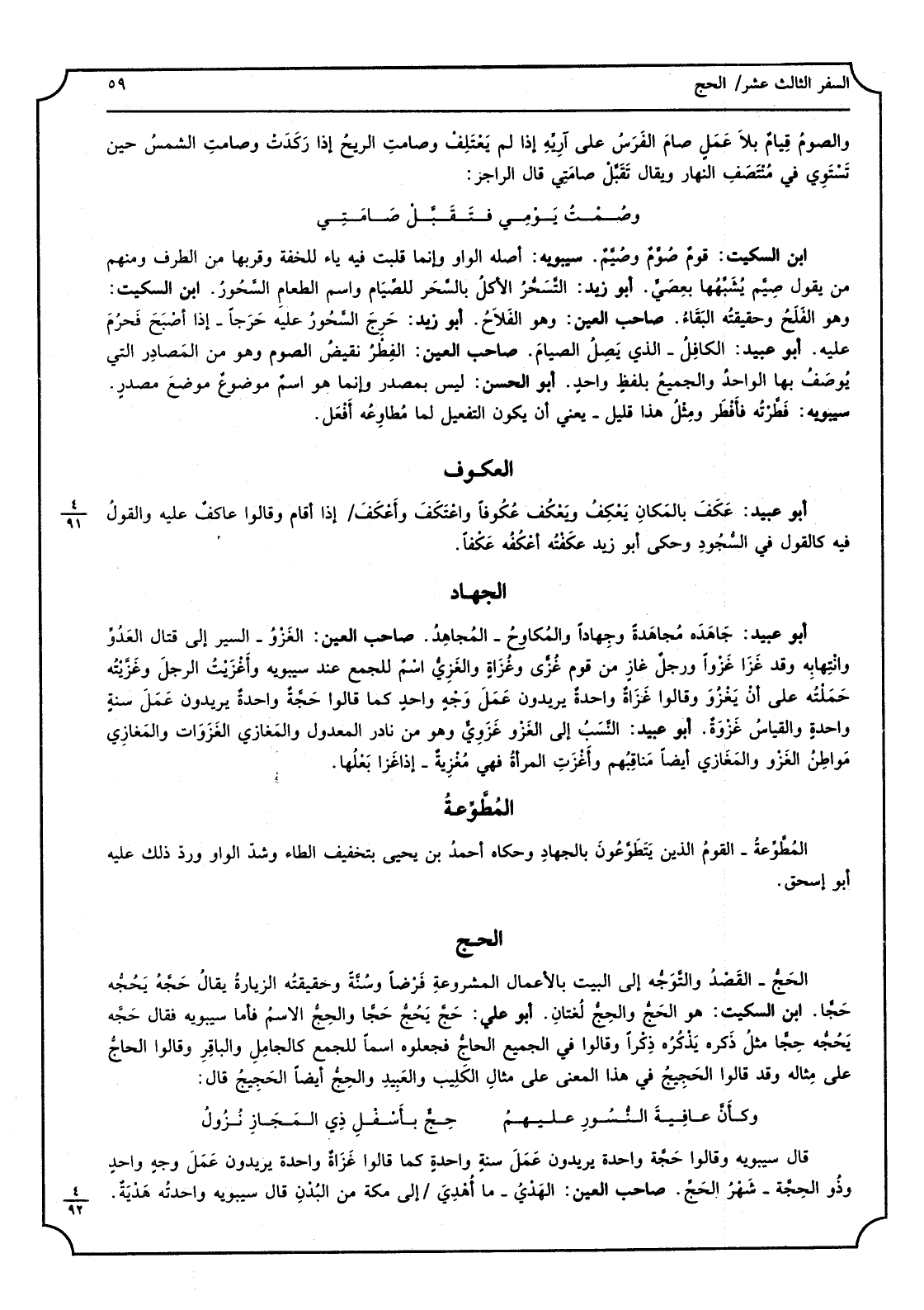 وَالصَّوْم قيام بِلَا عمل. صَامَ الْفرس على آرِبِه إِذا لم يعتلِف، وصامت الرّيح إِذا ركدت، وصامت الشّمس حِين تستوي فِي منتصف النّهار وَيُقَال تَقَّبل صامَتي، قَالَ الرّاجز: وصمتُ يومي فتقبَّل صامَتي ابْن السّكيت: قومٌ صُوَمٌ وصُيَّم. سِيبَوَيْهٍ: أَصله الْوَاو وَإِنَّمَا قلبت فِيهِ يَاء للخفة وقربها من الطّرف وَمِنْهُم من يَقُول صِيَّم يُشبّهها بعِصِيّ. أَبُو زيد: التّسَحُّر الْأكل بالسّحَر للصيام وَاسم الطّعام السّحور. ابْن السّكيت: وَهُوَ الفَلَح وَحَقِيقَته الْبَقَاء. صَاحب الْعين: وَهُوَ الفَلاح. أَبُو زيد: حَرِج السّحور علينا حَرَجاً: إِذا أصبح فحَرُم علينا. أَبُو عُبَيْد: الكافِل: الَّذِي يصِل الصّيام. صَاحب الْعين: الفِطْر: نقيض الصَّوْم وَهُوَ من المصادر التّي يُوصف بهَا الْوَاحِد والجميع بِلَفْظ وَاحِد. أَبُو الْحسن: لَيْسَ بمصدر وَإِنَّمَا هُوَ اسْم مَوْضُوع مَوْضِع مصدر. سِيبَوَيْهٍ: فَطَّرْته فأفْطَر وَمثل هَذَا قَلِيل: يَعْنِي أَن يكون التّفعيل لما مُطاوِعه أَفْعَل.