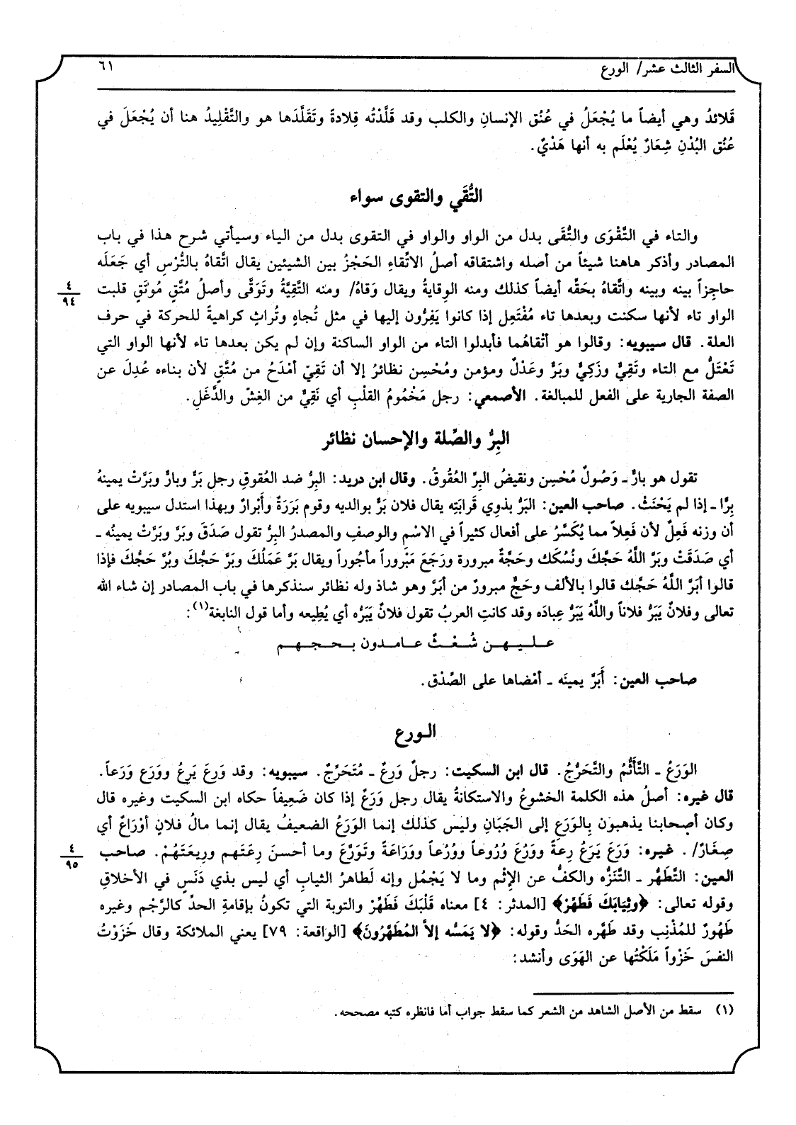 والتّاء فِي التّقوى والتّقى بدل من الْوَاو وَالْوَاو فِي التّقوى بدل من الْيَاء وَسَيَأْتِي شرح هَذَا فِي بَاب المصادر وأذكر هَهُنَا شَيْئا من أَصله واشتقاقه: أصل الاتِّقاء الحَجْز بَين الشّيئين، يُقَال: اتَّقاه بالتّرس أَي جعله حاجزاً بَينه وَبَينه، واتقاه بحَقِّه أَيْضا كَذَلِك وَمِنْه الوِقاية وَيُقَال وَقاه وَمِنْه التّقِيَّة وتَوَقَّى وأصل مُتَّقِ موتَقٍ قلبت الْوَاو تَاء لِأَنَّهَا أسكنت وَبعدهَا تَاء مُفْتَعِل إِذْ كَانُوا يفرون إِلَيْهَا فِي مثل تُجاه وتُراث كَرَاهِيَة للحركة فِي حرف الْعلَّة. قَالَ سِيبَوَيْهٍ: وَقَالُوا: هُوَ أتْقاهما فأبدلوا التّاء من الْوَاو السّاكنة وَإِن لم يكن بعْدهَا تَاء لِأَنَّهَا الْوَاو التّي تعتلُّ مَعَ التّاء وتَقِيّ وزَكِيّ وبَرّ وعَدْل وَمُؤمن ومُحسن نَظَائِر إلاّ أَن تَقِيّ أمدح من مُتَّقِ لِأَن بناءه عُدل عَن الصّفة الْجَارِيَة على الْفِعْل للْمُبَالَغَة. الْأَصْمَعِي: رجل مَخموم الْقلب: أَي تقيٌّ من الْغِشّ والدّغْل.