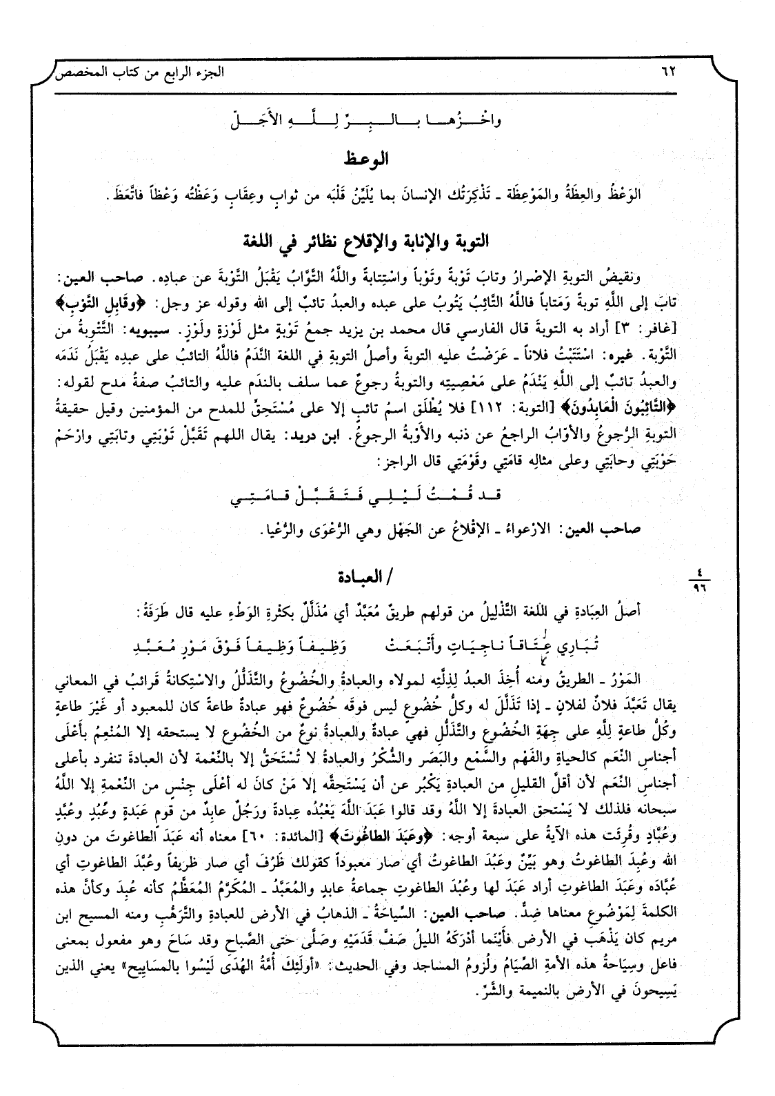 أصل الْعِبَادَة فِي اللُّغَة التّذليل من قَوْلهم: طَرِيق مُعَبَّد: أَي مُذّلَّل، بِكَثْرَة الْوَطْء عَلَيْهِ، قَالَ طَرَفة: تُباري عِتاقاً ناجِياتٍ وأتبعَتْ وَظيفاً وظيفاً فَوق مَوْرٍ مُعَبَّد المَوْر: الطّريق وَمِنْه أُخذ العَبْد لذلته لمَوْلَاهُ وَالْعِبَادَة والخضوع والتّذلل والاستكانة قرائب فِي الْمعَانِي، يُقَال: تَعَبَّ فلَان لفُلَان: إِذا تذلل لَهُ، وكل خضوع لَيْسَ فَوْقه خضوع فَهُوَ عبَادَة، طَاعَة كَانَ للمعبود أَو غيرَ طَاعَة. وكل طَاعَة لله على جِهَة الخضوع والتّذلل فَهِيَ عبَادَة وَالْعِبَادَة نوع من الخضوع لَا يسْتَحقّهُ إلاّ المُنعِم بِأَعْلَى أَجنَاس النّعم كالحياة والفهم والسّمع وَالْبَصَر والشّكر، وَالْعِبَادَة لَا تُستحق إلاّ بالنّعمة لِأَن الْعِبَادَة تنفرد بِأَعْلَى أَجنَاس النّعم لِأَن أقل الْقَلِيل من الْعِبَادَة يكبُر عَن أَن يسْتَحقّهُ إلاّ من كَانَ لَهُ أَعلَى جنس من النّعمة إلاّ الله سُبْحَانَهُ فَلذَلِك لَا يسْتَحق الْعِبَادَة إلاّ الله، وَقد قَالُوا: عَبَد الله يعبُده عِبادة وَرجل عابِد من قوم عَبَدَة وعُبُد وعُبَّد وعُبَّاد، وقرئت هَذِه الْآيَة على سَبْعَة أوجه: (وعَبَدَ الطّاغوت) مَعْنَاهُ أَنه عَبَدَ الطّاغوت من دون الله، وعُبِد الطّاغوت وَهُوَ بيِّن، وعَبُدَ الطّاغوت أَي صَار معبوداً كَقَوْلِك ظَرُفَ أَي صَار ظريفاً، وعُبَّدَ الطّاغوت أَي عُبّاده، وعَبَد الطّاغوت أَرَادَ عَبَد لَهَا، وعُبُدَ الطّاغوت جمَاعَة عَابِد، والمُعَبَّد: المُكرّم المُعظّم كَأَنَّهُ عُبد وَكَأن هَذِه الْكَلِمَة لموضوع مَعْنَاهَا ضد. صَاحب الْعين: السّياحَة: الذّهاب فِي الأَرْض لِلْعِبَادَةِ والتّرَهُّب وَمِنْه الْمَسِيح ابْن مَرْيَم كَانَ يذهب فِي الأَرْض فأينما أدْركهُ اللَّيْل صَفَّ قَدَمَيْهِ وَصلى حَتَّى الصَّباح وَقد ساحَ وَهُوَ مفعول بِمَعْنى فَاعل، وسِياحة هَذِه الأُمَّة الصّيام وَلُزُوم الْمَسَاجِد، وَفِي الحَدِيث: (أُولَئِكَ أمّةُ الْهدى لَيْسُوا بالمساييح) يَعْنِي الَّذِي يسيحون فِي الأَرْض بالنّميمة والشّر.