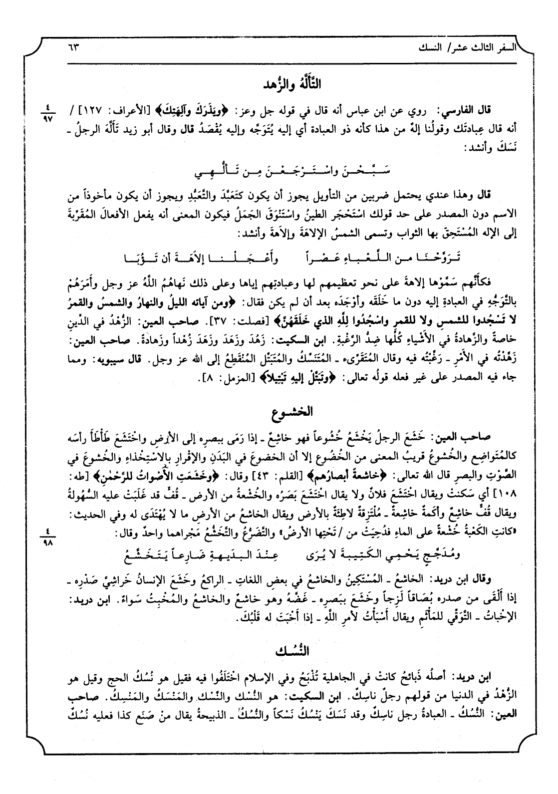 قَالَ الْفَارِسِي: رُوِيَ عَن ابْن عَبَّاس أَنه قَالَ فِي قَوْله عز وَجل: (ويذَرَك وآلِهَتَك) أَنه قَالَ عبادتك، وَقَوْلنَا إِلَه من هَذَا كَأَنَّهُ ذُو الْعِبَادَة أَي إِلَيْهِ يُتوجه وَإِلَيْهِ يُقصد، قَالَ: وَقَالَ أَبُو زيد: تألَّه الرَّجُل: نَسَك، وَأنْشد: سَبَّحْنَ واستَرْجَعْنَ من تأَلُّهِي قَالَ: وَهَذَا عِنْدِي يحْتَمل ضَرْبَيْنِ من التّأويل: يجوز أَن تكون كتعَبَّد والتّعَبُّد وَيجوز أَن يكون مأخوذاً من الِاسْم دون الْمصدر على حد قَوْلك استَحْجَر الطّين واسْتَنْوَق الْجمل، فَيكون الْمَعْنى أَنه يفعل الأَفعال المُقرّبة إِلَى الإِله الْمُسْتَحق بهَا الثّواب، وتُسمى الشّمس الإِلاهة وإلاهَة، وَأنْشد: تَرَوَّحْنا من اللعباء عَصْراً وأعجلْنا إلاهةَ أَن تَؤبا فكأنهم سَموهَا إلاهة على نَحْو تعظيمهم لَهَا وعبادتهم إِيَّاهَا وعَلى ذَلِك نَهَاهُم الله عز وَجل وَأمرهمْ بالتّوجه فِي الْعِبَادَة إِلَيْهِ دون مَا خلقه وأوجده بعد أَن لم يكن فَقَالَ: (وَمن آيَاته اللَّيْل والنّهار والشّمس وَالْقَمَر لَا تسجدوا للشمس وَلَا للقمر واسجدوا لله الَّذِي خلقهنّ) . صَاحب الْعين: الزّهْد فِي الدِّين خَاصَّة والزَّهادة فِي الْأَشْيَاء كلهَا ضد الرّغبة. ابْن السّكيت: زَهُدَ وزَهَد زُهْداً وزَهادة. صَاحب الْعين: زَهَّدْته فِي الْأَمر: رغّبته فِيهِ، وَقَالَ المُتقرِّئ: المُتنسّك والمُتبتّل: الْمُنْقَطع إِلَى الله عز وَجل. قَالَ سِيبَوَيْهٍ: وَمِمَّا جَاءَ فِيهِ الْمصدر على غير فعله قَوْله تَعَالَى: (وتَبَتَّل إِلَيْهِ تَبْتيلا) .