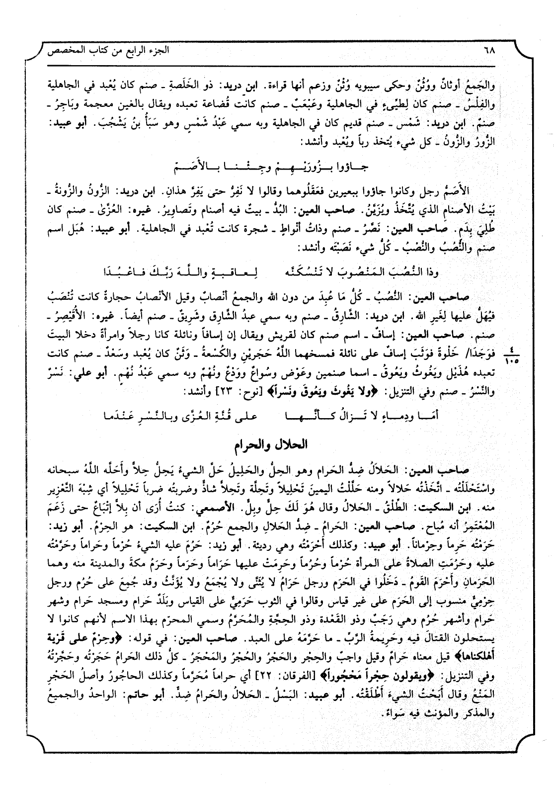 صَاحب الْعين: الْحَلَال ضد الْحَرَام وَهُوَ الحِلّ والحَليل، حَلّ الشّيء يحِلّ حِلاًّ وأحَلَّه الله سُبْحَانَهُ، واستحللته: اتخذته حَلَالا، وَمِنْه حَلَلْت الْيَمين تَحليلاً وتَحِلَّة وتَحِلاًّ شَاذ، وضربته ضربا تَحليلاً أَي شبه التّعزيز مِنْهُ. ابْن السّكيت: الطّلْق: الْحَلَال، وَقَالَ: هُوَ لَك حِلٌّ وبِلّ. الْأَصْمَعِي: كنت أرى أَن بلاًّ اتِّبَاع حَتَّى زعم الْمُعْتَمِر أَنه مُبَاح. صَاحب الْعين: الْحَرَام: ضد الْحَلَال وَالْجمع حُرُم. ابْن السّكيت: هُوَ الحِرْم. أَبُو زيد: حَرَمْته حَرِماً وحِرْماناً. أَبُو عُبَيْد: وَكَذَلِكَ أحْرَمْته وَهِي رَدِيئَة. أَبُو زيد: حَرُم عَلَيْهِ الشّيء حُرْماً وحَراماً وحَرَّمْته عَلَيْهِ، وحَرُمَت الصَّلَاة على الْمَرْأَة حُرْماً وحُرُماً وحَرِمَت عَلَيْهَا حَراماً وحَرَماً وحَرَم مَكَّة وَالْمَدينَة مِنْهُ وهما الحَرَمان، واحْرَم الْقَوْم: دخلُوا فِي الحَرَم، وَرجل حَرام لَا يُثَنّى وَلَا يُجمع وَلَا يؤنث وَقد جُمع على حُرُم، وَرجل حِرْمِيّ: مَنْسُوب إِلَى الحَرَم على غير قِيَاس، وَقَالُوا فِي الثّواب: حَرَمِيٌّ على الْقيَاس، وبلد حَرام وَمَسْجِد حَرام وَشهر حرَام وَأشهر حُرُم، وَهِي رَجَب وَذُو الْقعدَة وَذُو الْحجَّة وَالْمحرم، وَسمي الْمحرم بِهَذَا الِاسْم لأَنهم كَانُوا لَا يسْتَحلُّونَ الْقِتَال فِيهِ، وحَريمة الرّبّ: مَا حَرَّمَه على العَبْد. صَاحب الْعين: فِي قَوْله: (وحَرامٌ على قَرْيَة أهلكناها) قيل مَعْنَاهَا حَرام، وَقيل وَاجِب، والحِجْر والحَجْر والحُجْر والمَحْجَر: كل ذَلِك الْحَرَام، حَجَرْته وحَجَّرْته، وَفِي التّنزيل: (وَيَقُولُونَ حِجْراً مَحْجورا) أَي حَرَامًا مُحَرَّماً، وَكَذَلِكَ الحاجور وأصل الحَجْر المَنْع، وَقَالَ: أَبَحْت الشّيء: أطلقته. أَبُو عُبَيْد: البَسْل: الْحَلَال وَالْحرَام ضد. أَبُو حَاتِم: الْوَاحِد والجميع والمذكر والمؤنث فِيهِ سَوَاء.