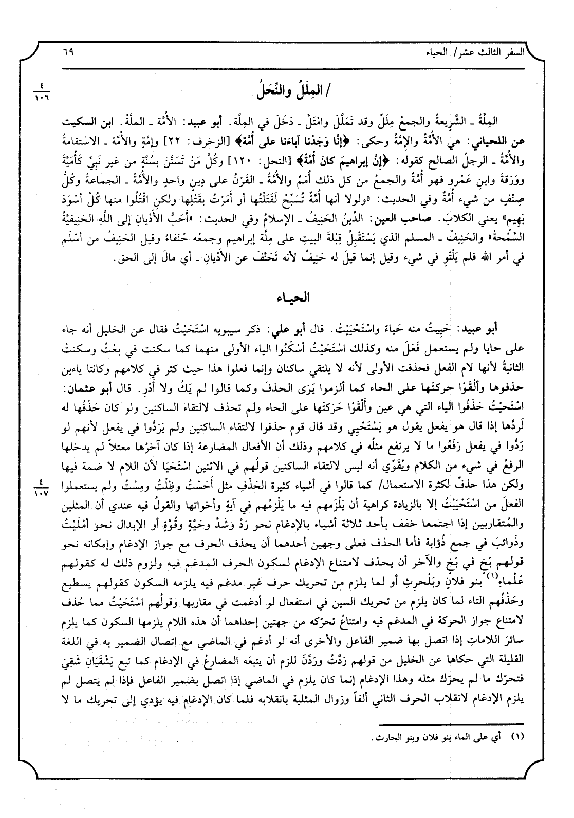 المِلَّة: الشّريعة، وَالْجمع مِلَل، وَقد تَمَلَّل، وامتلّ: دخل فِي الْملَّة. أَبُو عُبَيْد: الأُمَّة: المِلَّة. ابْن السّكيت: عَن اللحياني: هِيَ الأُمَّة والإمَّة، وَحكى: (إِنَّا وجدنَا آبَاءَنَا على أُمَّةٍ وإمَّة) . والأُمَّة: الاسْتقَامَة، والأُمّة: الرَّجُل الصَّالح كَقَوْلِه: (إِن إِبْرَاهِيم كَانَ أُمَّةً) . وكل من تَسَنَّنَ بسُنّة من غير نَبِي كأمية ووَرَقة وَابْن عَمْرو فَهُوَ أُمَّة، وَالْجمع من كل ذَلِك أُمَم، والأُمَّة: القَرْن على دين وَاحِد، والأُمَّة: الجامعة، وكل صنف من شَيْء أُمّة، وَفِي الحَدِيث: (وَلَوْلَا أَنَّهَا أمةٌ تُسبح لقتلتها أَو أمرت بقتلها وَلَكِن اقْتُلُوا مِنْهَا كل أسود بهيم) . يَعْنِي الْكلاب. صَاحب الْعين: الدّين الحَنيف: الإِسلام، وَفِي الحَدِيث: (أحَبُّ الْأَدْيَان إِلَى الله الحَنيفِيَّة السّمْحَة) . والحَنيف: الْمُسلم الَّذِي يسْتَقْبل قِبلة الْبَيْت على مِلّة إِبْرَاهِيم وَجمعه حُنَفاء، وَقيل الحنيف: من أسلم فِي أَمر الله فَلم يلتوِ فِي شَيْء وَقيل إِنَّمَا قيل لَهُ حنيف لِأَنَّهُ تَحَنَّف عَن الْأَدْيَان: أَي مَال إِلَى الْحق.