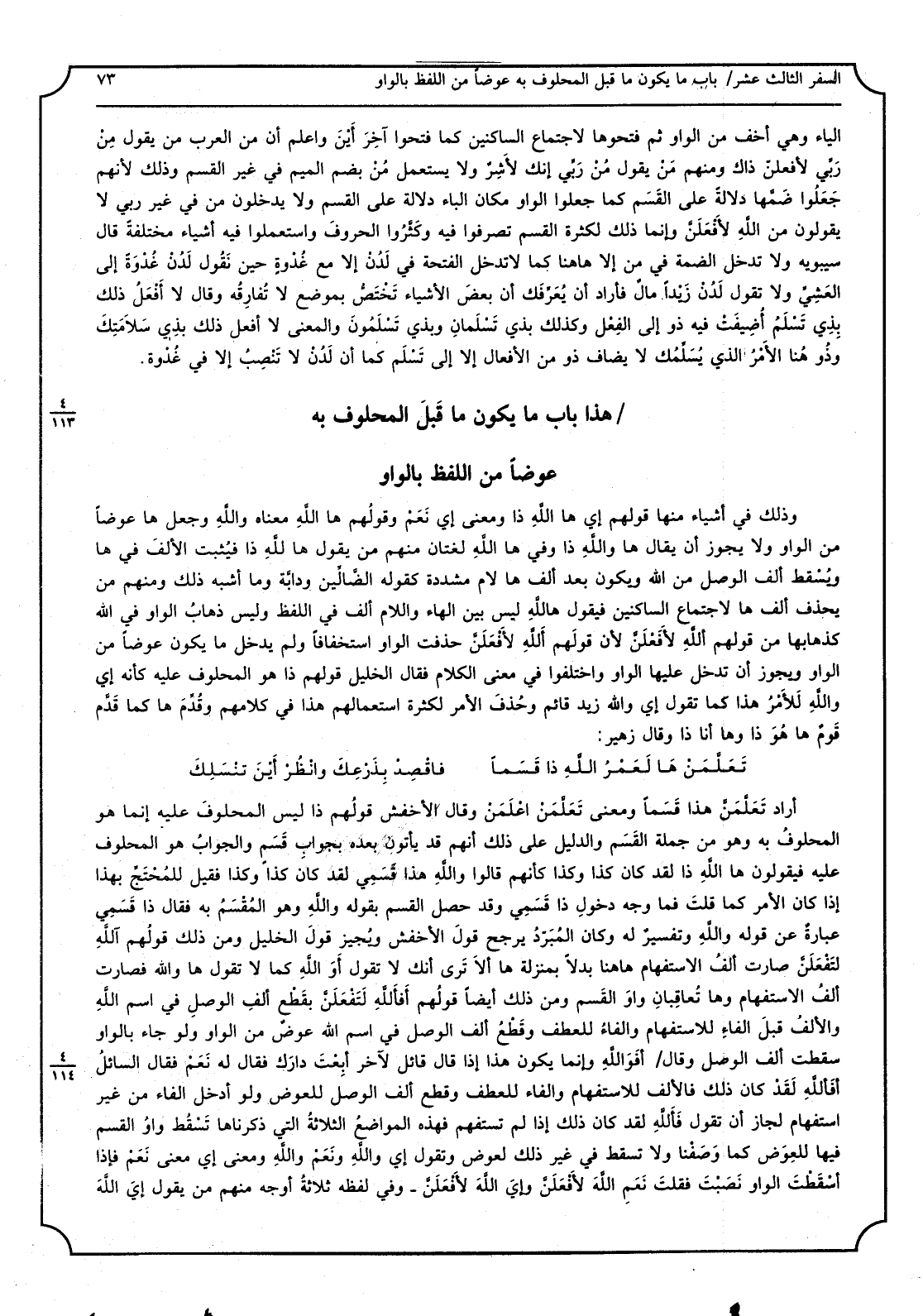 وَذَلِكَ فِي أَشْيَاء مِنْهَا قَوْلهم: إِي هَا الله ذَا: وَمعنى إِي: نعم، وَقَوْلهمْ: هَا الله مَعْنَاهُ واللهِ، وَجعل هَا عوضا من الْوَاو وَلَا يجوز أَن يُقَال هَا وَالله ذَا، وَفِي هَا الله لُغَتَانِ مِنْهُم من يَقُول هاللهِ ذَا فيُثبت الْألف فِي هَا ويُسقط ألف الْوَصْل من الله وَيكون بعد ألف هَا لَام مُشَدّدَة كَقَوْلِه الضّالّين ودابّة وَمَا أشبه ذَلِك، وَمِنْهُم من يحذف ألف هَا لِاجْتِمَاع السّاكنين فَيَقُول هاللهِ لَيْسَ بَين الْهَاء وَاللَّام ألف فِي اللَّفْظ وَلَيْسَ ذهَاب الْوَاو فِي الله كذهابها من قَوْلهم ألله لَأَفْعَلَنَّ لِأَن قَوْلهم ألله لَأَفْعَلَنَّ حذفت الْوَاو اسْتِخْفَافًا وَلم يدْخل مَا يكون عوضا من الْوَاو وَيجوز أَن تدخل عَلَيْهَا الْوَاو، وَاخْتلفُوا فِي معنى الْكَلَام، فَقَالَ الْخَلِيل: قَوْلهم ذَا هُوَ الْمَحْلُوف عَلَيْهِ كَأَنَّهُ إِي واللهِ لِلْأَمْرِ هَذَا. كَمَا تَقول: إِي وَالله زيد قَائِم، وحُذف الْأَمر لِكَثْرَة استعمالهم هَذَا فِي كَلَامهم، وقُدِّم هَا كَمَا قدّم قوم هَا هُوَ ذَا وَهَا أَنا ذَا، وَقَالَ زُهَيْر: تَعَلَّمْنَ هالَعَمْرُ اللهِ ذَا قَسَماً فاقصدْ بذَرْعِكَ وَانْظُر أَيْن تنْسَلِكَ أَرَادَ تَعَلَّمْنَ هَذَا قسما وَمعنى تَعَلَّمْنَ: اعلَمَنْ وَقَالَ الْأَخْفَش قَوْلهم ذَا لَيْسَ الْمَحْلُوف عَلَيْهِ إِنَّمَا هُوَ الْمَحْلُوف بِهِ وَهُوَ من جملَة الْقسم والدّليل على ذَلِك أَنهم قد يأْتونَ بعده بِجَوَاب قسم وَالْجَوَاب هُوَ الْمَحْلُوف عَلَيْهِ فَيَقُولُونَ هَا اللهِ ذَا لقد كَانَ كَذَا وَكَذَا، كَأَنَّهُمْ قَالُوا واللهِ هَذَا قسمي لقد كَانَ كَذَا وَكَذَا، فَقيل للمُحتجّ بِهَذَا إِذا كَانَ الْأَمر كَمَا قلت فَمَا وَجه دُخُول ذَا قَسمي وَقد حصل لَهُ الْقسم بقوله وَالله وَهُوَ المُقسم بِهِ، فَقَالَ: ذَا قسمي عبارَة عَن قَوْله وَالله وَتَفْسِير لَهُ، وَكَانَ الْمبرد يرجح قَول الْأَخْفَش ويُجيز قَول الْخَلِيل وَمن ذَلِك قَوْلهم آللهِ لتفعلنّ، صَارَت ألف الِاسْتِفْهَام هَهُنَا بَدَلا بِمَنْزِلَة هَا، إلاّ ترى أَنَّك لَا تَقول أوَالله كَمَا لَا تَقول هَا وَالله فَصَارَت ألف الِاسْتِفْهَام وَهَا تُعاقبان وَاو الْقسم وَمن ذَلِك أَيْضا قَوْلهم: أفأللهِ لتفعلن، بِقطع ألف الْوَصْل فِي اسْم الله وَالْألف قبل الْفَاء للاستفهام وَالْفَاء للْعَطْف وَقطع ألف الْوَصْل فِي اسْم الله عوض من الْوَاو وَلَو جَاءَ بِالْوَاو وَسَقَطت ألف الْوَصْل، وَقَالَ: أفَوَالله وَإِنَّمَا يكون هَذَا إِذا قَالَ قَائِل لآخر أبعت دَارك فَقَالَ لَهُ نعم فَقَالَ السّائل: أفألله لقد كَانَ ذَلِك، فالألف للاستفهام وَالْفَاء للْعَطْف وَقطع ألف الْوَصْل للعوض وَلَو أَدخل الْفَاء من غير اسْتِفْهَام لجَاز أَن تَقول فألله لقد كَانَ ذَلِك إِذا لم تستفهم فَهَذِهِ الْمَوَاضِع الثّلاثة التّي ذَكرنَاهَا تسْقط وَاو الْقسم فِيهَا للعوض كَمَا وَصفنَا وَلَا تسْقط فِي غير ذَلِك لعوض، وَتقول: إِي وَالله، ونَعَمْ وَالله، وَمعنى إِي معنى نعم، فَإِذا سَقَطت الْوَاو نصبتَ فَقلت نَعَمِ اللهَ لَأَفْعَلَنَّ وإيَ اللهَ لَأَفْعَلَنَّ. وَفِي لَفظه ثَلَاثَة أوجه مِنْهُم من يَقُول إيَ اللهَ