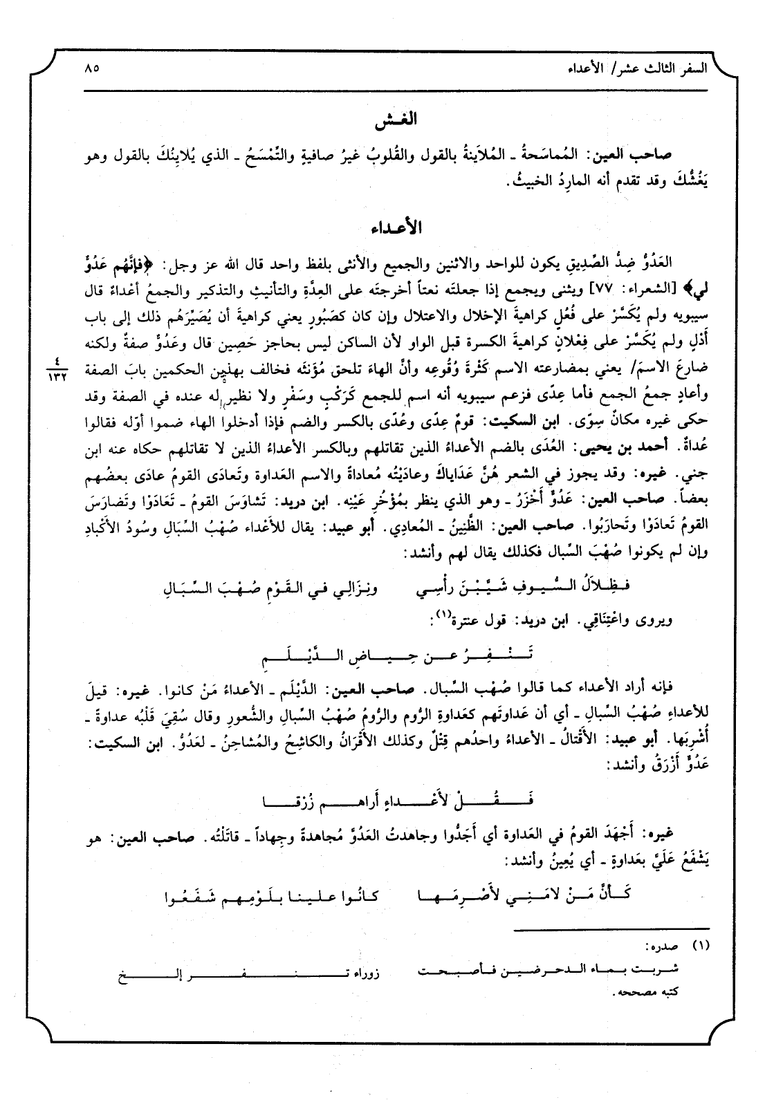 العدوّ ضد الصّديق، يكون للْوَاحِد والاثنين والجميع وَالْأُنْثَى بِلَفْظ وَاحِد. قَالَ الله عز وَجل: (فَإِنَّهُم عدوٌّ لي) . ويثنى وَيجمع إِذا جعلته نعتاً أخرجته على الْعدة والتّأنيث والتّذكير وَالْجمع أعْداء. قَالَ سِيبَوَيْهٍ: وَلم يُكسّر على فُعُل كَرَاهِيَة الإِخلال والاعتلال وَإِن كَانَ كصَبور يَعْنِي كَرَاهِيَة أَن يُصيّرهم ذَلِك إِلَى بَاب أدْلٍ وَلم يُكسّر على فِعْلان كَرَاهِيَة الكسرة قبل الْوَاو لِأَن السّاكن لَيْسَ بحاجز حُصَيْن، قَالَ: وعدُوّ صفة وَلكنه ضارع الِاسْم يَعْنِي بمضارعته الِاسْم كَثْرَة وُقُوعه وَأَن الْهَاء تلْحق مؤنثه فَخَالف بِهَذَيْنِ الْحكمَيْنِ بَاب الصّفة وَأعَاد جمع الْجمع فَأَما عِدى فَزعم سِيبَوَيْهٍ أَنه اسْم للْجمع كرَكْب وسَفْر وَلَا نَظِير لَهُ عِنْده فِي الصّفة وَقد حكى غَيره مكانٌ سِوَى. ابْن السّكيت: قوم عِدى وعُدى بِالْكَسْرِ والضّم فَإِذا أدخلُوا الْهَاء ضمُّوا أَوله فَقَالُوا عُداة، أَحْمد بن يحيى: العُدى بالضّم الْأَعْدَاء الَّذين تقَاتلهمْ وبالكسر الْأَعْدَاء الَّذين لَا تقَاتلهمْ، حَكَاهُ عَنهُ ابْن جني. غَيره: وَقد يجوز فِي الشّعر: هنّ عَداياك، وعادَيْته مُعاداة وَالِاسْم العَداوة وتعادى الْقَوْم عادى بَعضهم بَعْضًا. صَاحب الْعين: عدوٌ أخْزَر: وَهُوَ الَّذِي ينظر بمؤخر عينه. ابْن دُرَيْد: تَشاوَس الْقَوْم: تعادوا، وتَضارَس الْقَوْم تعادوا وتحاربوا. صَاحب الْعين: الظّنين: المُعادي. أَبُو عُبَيْد: يُقَال للأعداء صُهْب السّبال وسود الأكباد وَإِن لم يَكُونُوا صهب السّبال فَكَذَلِك يُقَال لَهُم وَأنْشد: فظلال السّيوف شَيَّبْن رَأْسِي ونِزالي فِي الْقَوْم صُهب السّبالِ ويروى واعتِناقي. ابْن دُرَيْد: قَول عنترة: تنفِر عَن حِياضِ الدّيْلَمِ فَإِنَّهُ أَرَادَ الْأَعْدَاء كَمَا قَالُوا صهب السّبال. صَاحب الْعين: الدّيْلم: الْأَعْدَاء من كَانُوا. غَيره: قيل للأعداء صهب السّبال: أَي أَن عداوتهم كعداوة الرّوم وَالروم صهب السّبال والشّعور وَقَالَ: سُقِي قلبه عَدَاوَة: أُشرِبها. أَبُو عُبَيْد: الأَقتال: الْأَعْدَاء واحدهم قِتْل، وَكَذَلِكَ الإِقران والكاشِح والمُشاحِن: الْعَدو. ابْن السّكيت: عَدو أَزْرَق وَأنْشد: فَقل لأعداء أَرَاهُم زُرْقا غَيره: أجْهَد الْقَوْم فِي الْعَدَاوَة أَي أجَدّوا، وجاهدت الْعَدو مجاهدة وجهاداً: قَاتلته. صَاحب الْعين: هُوَ يَشْفَع عَليّ بعداوة: أَي يُعين وَأنْشد: كَأَن من لامني لأصرمها كَانُوا علينا بلَومهم شَفَعوا