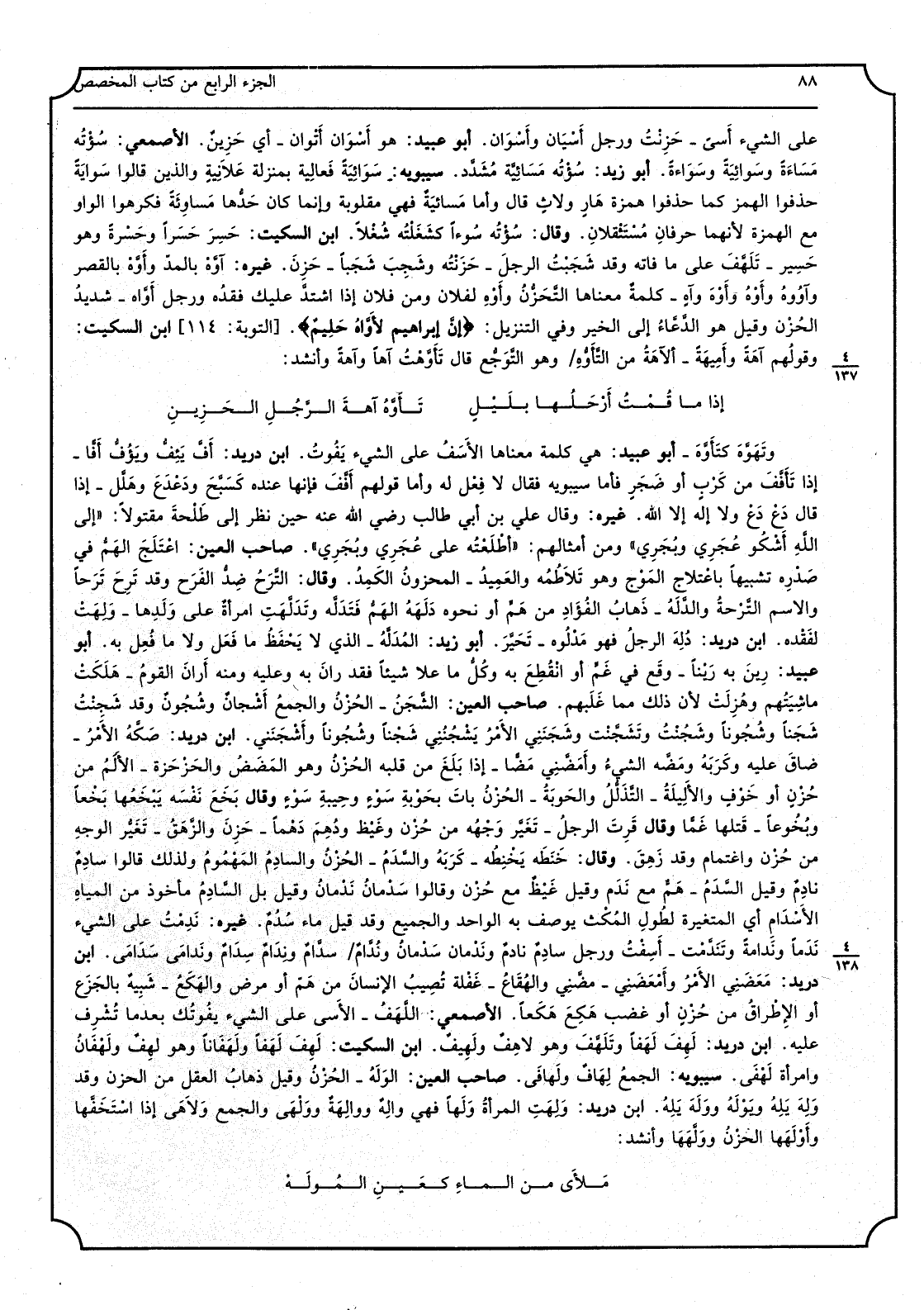 على الشّيء أسىً: حزنت، وَرجل أسيان وأسوان. أَبُو عُبَيْد: هُوَ أسوان أتْوان: أَي حَزِين. الْأَصْمَعِي: سؤْتُه مساءةً وسوائيةً وسواءَ ةً. أَبُو زيد: سُؤته مسائية مشدَّد. سِيبَوَيْهٍ: سوائية فعالية بِمَنْزِلَة عَلَانيَة وَالَّذين قَالُوا سَواية حذفوا الْهَمْز كَمَا حذفوا همزَة هارٍ ولاثٍ، قَالَ وَأما مسائيةٌ فَهِيَ مَقْلُوبَة وَإِنَّمَا كَانَ حدُّها مَساوئَةً فكرهوا الْوَاو مَعَ الْهمزَة لِأَنَّهُمَا حرفان مستثقلان. وَقَالَ: سُؤْته سُؤاً كشغلته شُغلاً. ابْن السّكيت: حسِر حسَراً وحسْرة وَهُوَ حسِير: تلهَّف على مَا فَاتَهُ، وَقد شجبت الرَّجُل: حزَنتُه، وشجِبَ شجَباً: حزِن. غَيره: أوَّه بالمدِّ وأوَّه بِالْقصرِ وآووه وأوُِهُ وأَوْهَ وآهٍ: كلمة مَعْنَاهَا التّحزُّن، وأوْه لفُلَان وَمن فلَان إِذا اشْتَدَّ عَلَيْك فَقده، ورجلٌ أوَّاهٌ: شَدِيد الْحزن وَقيل هُوَ الدّعاء إِلَى الْخَيْر وَفِي التّنزيل: (إنَّ إِبْرَاهِيم لأوّاهٌ حَلِيم) . ابْن السّكيت: وَقَوْلهمْ آهةً وأَمِيهةً: ألآهة من التّأَوُّه وَهُوَ التّوجُّع قَالَ تأوَّهْت آهاً وآهةً وَأنْشد: إِذا مَا قُمْت أرْحَلُها بلَيْلٍ تأوَّه آهة الرَّجُل الحزين وتهوَّه كتأوَّه. أَبُو عُبَيْد: هِيَ كلمة مَعْنَاهَا الأسف على الشّيء يفوت. ابْن دُرَيْد: أفَّ يئفُّ ويؤفُّ أفّاً: إِذا تأفَّف من كرب أَو ضجر فَأَما سِيبَوَيْهٍ فَقَالَ لَا فعل لَهُ وَأما قَوْلهم أفّف فَإِنَّهَا عِنْده كسبَّح ودعدع وهلَّل: إِذا قَالَ دَعْ دَعْ وَلَا إِلَه إلاّ الله. غَيره: وَقَالَ عَليّ بن أبي طَالب رَضِي الله عَنهُ حِين نظر إِلَى طَلْحَة مقتولاً: إِلَى الله أَشْكُو عُجَري وبُجَري. وَمن أمثالهم: أطلعته على عجري وبُجري. صَاحب الْعين: اعتلج الهمُّ فِي صَدره تَشْبِيها باعتلاج الموج وَهُوَ تلاطمه، والعميد: المحزون الكمِد. وَقَالَ: التّرح: ضد الْفَرح وَقد ترِح ترَحاً وَالِاسْم التّرْحة والدّلَه: ذهَاب الْفُؤَاد من همٍّ أَو نَحوه، دلَهَه الهمُّ فتدلَّه، وتدلَّهت امْرَأَة على وَلَدهَا: وَلِهَت لفقده. ابْن دُرَيْد: دُلِه الرَّجُل فَهُوَ مدلوه: تحيَّر. أَبُو زيد: المدلَّه: الَّذِي لَا يحفظ مَا فعل وَلَا مَا فُعِل بِهِ. أَبُو عُبَيْد: رِينَ بِهِ رَيْناً: وَقع فِي غمٍّ أَو انقُطِع بِهِ، وكل مَا علا شَيْئا فقد رانَ بِهِ وَعَلِيهِ، وَمِنْه أران الْقَوْم: هَلَكت ماشيتهم وهُزِلت لِأَن ذَلِك مِمَّا غلبهم. صَاحب الْعين: الشّجَن: الحزْن وَالْجمع أشجان وشُجون وَقد شجِنت شَجَناً وشُجوناً وشَجُنت وتشجَّنت وشجنني الْأَمر يشْجُنني شَجْناً وشُجوناً وأشجَنني. ابْن دُرَيْد: صكَّه الْأَمر: ضَاقَ عَلَيْهِ وكرَبَه، ومضَّه الشّيء وأمضَّني مَضّاً: إِذا بلغ من قلبه الْحزن وَهُوَ المضض، والحزْحَزة: الْأَلَم من حزن أَو خوف، والآليلة: التّذلُّل، والحَوْبة: الْحزن بَات بحَوْبةِ سَوءٍ وحِيبة سَوء، وَقَالَ بخَع نَفسه يبخعُها بَخْعاً وبُخوعاً: قَتلهَا غمّاً، وَقَالَ قَرِتَ الرَّجُل: تغيَّر وَجهه من حزن وغيظ، ودُهِم دَهماً: حزِن، واللَّهَق: تغيُّر الْوَجْه من حزن واغتمام وَقد زهِق. وَقَالَ خَنَطَه يخنِطُه: كرَبَه، والسّدَم: الْحزن، والسّادم: المهموم، وَلذَلِك قَالُوا سادِمٌ نادِمٌ، وَقيل السّدَم: همٌّ مَعَ نَدم وَقيل: غيظ مَعَ حزن، وَقَالُوا سدمان ندمان وَقيل بل السّادم مَأْخُوذ من الْمِيَاه الأَسْدام أَي المتغيِرة لطول المُكْث يُوصف بِهِ الْوَاحِد والجميع وَقد قيل ماءٌ سُدُمٌ. غَيره: ندِمت على الشّيء ندَماً وندامة، وتندَّمت: أسفت، وَرجل سادم نادم وندمان سَدمان ونُدّامٌ سُدَّامٌ ونُدامٌ سِدامٌ ونَدامى سَدامى. ابْن دُرَيْد: معَضني الْأَمر وأمْعضَني: مضَّني، والهُقاع: غَفلَة تصيب الإِنسان من همٍّ أَو مرض، والهَكَع: شَبيه بالجزَع أَو الإِطراق من حجزن أَو غضب هكِع هكَعاً. الْأَصْمَعِي: اللهَفُ: الأسى على الشّيء يفوتك بعد مَا تشرف عَلَيْهِ. ابْن دُرَيْد: لهِف
