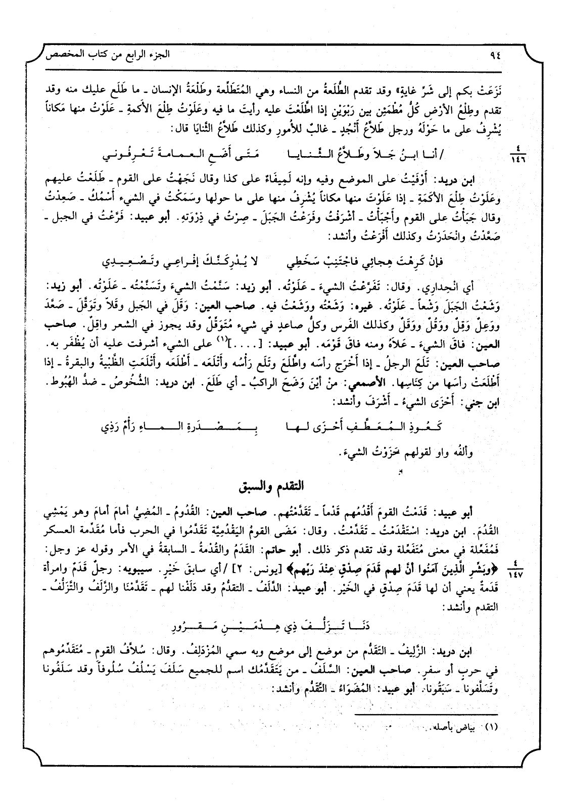 أَبُو عُبَيْد: قَدَمْت الْقَوْم أقدُمهم قَدْماً: تقدّمتهم. صَاحب الْعين: القُدوم: المُضيّ أَمَام أَمَام وَهُوَ يمشي القُدُم. ابْن دُرَيْد: استقدمت: تقدّمت. وَقَالَ: مضى الْقَوْم اليَقْدُمِيَّة: تقدمُوا فِي الْحَرْب، فَأَما مُقَدِّمَة الْعَسْكَر فمُفَعِّلَة فِي معنى مُتَفَعِّلَة وَقد تقدم ذكر ذَلِك. أَبُو حَاتِم: القَدَم والقُدْمَة: السّابقة فِي الْأَمر، وَقَوله عز وَجل: (وبشِّر الَّذين آمنُوا أَن لَهُم قَدَمَ صدقٍ عِنْد رَبهم) أَي سَابق خير. سِيبَوَيْهٍ: رجلٌ قَدَم وَامْرَأَة قَدَمَ يَعْنِي أَن لَهَا قَدَم صدق فِي الْخَيْر. أَبُو عُبَيْد: الدّلَف: التّقدم، وَقد دَلَفْنا لَهُم: تقدمنا، والزَّلَف والتّزَلُّف: التّقدم وَأنْشد: دنا تَزَلُّفَ ذِي هِدْمَيْن مَقرورِ ابْن دُرَيْد: الزّليف: التّقدم من مَوْضِع إِلَى مَوْضِع وَبِه سمي المُزْدَلِف. وَقَالَ: سُلاَّف الْقَوْم: مُتقدموهم فِي حَرْب أَو سفر. صَاحب الْعين: السّلَف: من يتقدمك، اسْم للْجَمِيع. سَلَف يسلُف سُلوفاً، وَقد سَلَفونا وتَسَلَّفونا: سبقُونَا. أَبُو عُبَيْد: المُضَواء: التّقدم وَأنْشد: