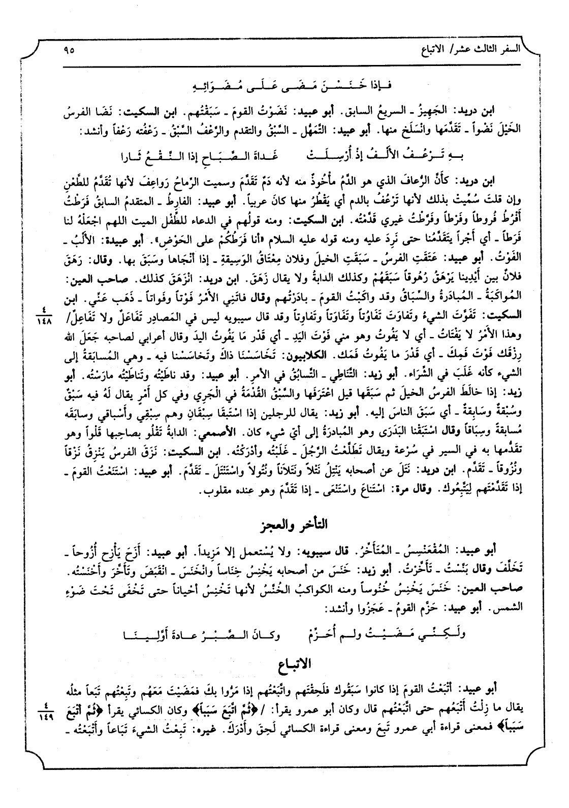 فَإِذا خَنَسْنَ مضى على مُضَوائِهِ ابْن دُرَيْد: الجَهيز: السّريع السّابق. أَبُو عُبَيْد: نَضَوْت الْقَوْم: سبقتهم. ابْن السّكيت: نَضا الفرسُ الخيلَ نَضْواً: تقدمها وانسلخ مِنْهَا. أَبُو عُبَيْد: التّمَهُّل: السّبق والتّقدم، والرُّعْف: السّبق، رَعَفْته رَعْفاً، وَأنْشد: بِهِ ترْعُفُ الأَلْفُ إِذْ أُرسِلَتْ غَداة الصَّباحِ إِذا النَّقعُ ثارا ابْن دُرَيْد: كَأَن الرّعاف الَّذِي هُوَ الدّم مَأْخُوذ مِنْهُ لِأَنَّهُ دم تقدم وَسميت الرّماح رَواعِف لِأَنَّهَا تقدم لِلطَّعْنِ وَإِن قلت سميت بذلك لِأَنَّهَا ترعُف بالدّم أَي يقطر مِنْهَا كَانَ عَرَبيا. أَبُو عُبَيْد: الفارِط: الْمُتَقَدّم السّابق، فرَطْت أفرُط فُروطاً وفَرْطاً وفَرَّطْت غَيْرِي: قَدمته. ابْن السّكيت: وَمِنْه قَوْلهم فِي الدّعاء للطفل الْمَيِّت: اللَّهُمَّ اجْعَلْهُ لنا فَرَطاً: أَي أجرا يتقدمنا حَتَّى نرد عَلَيْهِ، وَمِنْه قَوْله عَلَيْهِ السّلام: (أَنا فَرَطُكم على الْحَوْض) . أَبُو عُبَيْدة: الألب: الفَوْت. أَبُو عُبَيْد: عَتَقَتِ الْفرس: سبقت الْخَيل وَفُلَان مِعتاق الوَسيقة: إِذا أنجاها وَسبق بهَا. وَقَالَ: رَهَق فلَان بَين أَيْدِينَا يرهَق رُهوقاً: سبقهمْ وَكَذَلِكَ الدّابة وَلَا يُقَال زَهَق. ابْن دُرَيْد: انزَهَق كَذَلِك. صَاحب الْعين: المُواكَبَة: الْمُبَادرَة والسّباق، وَقد واكَبْت الْقَوْم: بادرتهم، وَقَالَ: فتَني الْأَمر فَوْتاً وفَواتاً: ذهب عني. ابْن السّكيت: تَفَوَّت الشّيء وتفاوَت تَفاوُتاً وتَفاوَتاً وتفاوِتاً، وَقد قَالَ سِيبَوَيْهٍ: لَيْسَ فِي المصادر تَفاعَل وَلَا تَفاعِل، وَهَذَا الْأَمر لَا يَفْتات: أَي لَا يَفوت، وَهُوَ مني فَوْت الْيَد: أَي قدر مَا يفوت الْيَد، وَقَالَ أَعْرَابِي لصَاحبه: جعل الله رزقك فَوْت فمك: أَي قدر مَا يفوت فمك. الكلابيون: تَخاسَسْنا ذَاك وتخاسسنا فِيهِ: وَهِي الْمُسَابقَة إِلَى الشّيء، كَأَنَّهُ غلب فِي الشّراء. أَبُو زيد: التّناطِي: التّسابق فِي الْأَمر. أَبُو عُبَيْد: وَقد ناطَيْته وتَناطَيْته: مارسته. أَبُو زيد: إِذا خالطّ الفرسُ الخيلَ ثمَّ سبقها قيل اعْتَرَفها، والسّبق القُدْمَة فِي الجري وَفِي كل أَمر يُقَال لَهُ فِيهِ سَبْق وسُبْقَة وسابِقَة: أَي سبق النّاس إِلَيْهِ. أَبُو زيد: يُقَال للرجلين إِذا استَبَقا: سِبْقان، وهم سِبْقي وأَسْباقي وسابَقَه مُسابَقة وسِباقاً، وَقَالَ: استبقْنا البَدَرَي وَهُوَ الْمُبَادرَة إِلَى أَي شَيْء كَانَ، الْأَصْمَعِي: الدّابة تَقْلو بصاحبها قَلْواً: وَهُوَ تقدمها بِهِ فِي السّير فِي سرعَة، وَيُقَال: تَطَلَّعت الرَّجُل: غلبته وأدركته. ابْن السّكيت: نَزَق الْفرس سنْزِق نَزْقاً ونُزوقاً: تقدم. ابْن دُرَيْد: نَتَل عَن أَصْحَابه، ينْتِل نَتْلاً ونَتَلاناً ونُتولاً واسْتَنْتَل: تقدم. أَبُو عُبَيْد: اسْتَنَعْتُ الْقَوْم: إِذا تقدمتهم ليتّبعوك. وَقَالَ مرّة: اسْتَناع واسْتَنْعى: إِذا تقدم وَهُوَ عِنْده مقلوب.