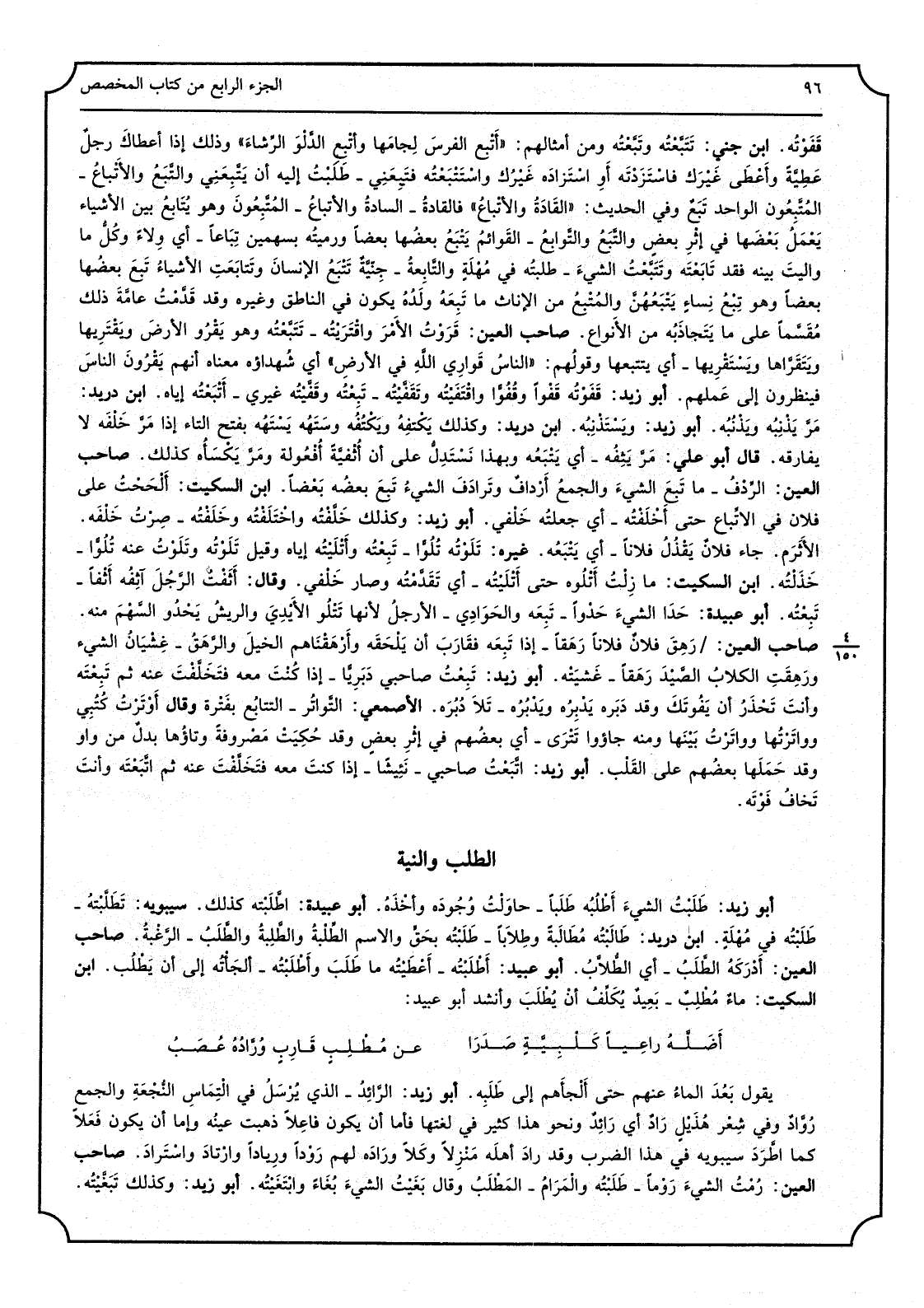 أَبُو زيد: طَلَبْت الشّيء أطلُبه طَلَباً: حاولت وجوده وَأَخذه. أَبُو عُبَيْدة: اطَّلَبْته كَذَلِك. سِيبَوَيْهٍ: تَطَلَّبْته: طلبته فِي مهلة. ابْن دُرَيْد: طالَبْته مُطالَبَة وطِلاباً: طلبته بِحَق وَالِاسْم الطّلْبَة والطّلْبَة والطّلَب: الرّغبة. صَاحب الْعين: أدْرَكَه الطّلَب: أَي الطّلاّب. أَبُو عُبَيْد: أطلبته: أَعْطيته مَا طلب، وأطلبته: ألجأته إِلَى أَن يطْلب. ابْن السّكيت: ماءٌ مُطْلِب: بعيد يُكلِّف أَن يُطلب، وَأنْشد أَبُو عُبَيْد: أضَلَّه رَاعيا كلبِيَّةٍ صَدَرا عَن مُطْلِبٍ قارِبٍ وُرَّادُهُ عُصَبُ يَقُول بعد المَاء عَنْهُم حَتَّى ألجأهم إِلَى طلبه. أَبُو زيد: الرّائد: الَّذِي يُرسل فِي التّماس النّجعة، وَالْجمع رُوَّاد، وَفِي شعر هُذيل رادٌ أَي رائد، وَنَحْو هَذَا كثير فِي لغتها فإمَّا أَن يكون فَاعِلا ذهبت عينه وَإِمَّا أَن يكون فَعَلاً كَمَا اطَّرد سِيبَوَيْهٍ فِي هَذَا الضّرب وَقد رادَ أَهله منزلا وكَلأً ورادَه لَهُم رَوْداً ورياداً وارْتاد واسْتَراد. صَاحب الْعين: رُمْت الشّيء رَوْماً: طلبته، والمَرام: المَطْلَب، وَقَالَ: بَغَيْت الشّيء بُغاءً وابتغيته. أَبُو زيد: وَكَذَلِكَ تَبَغَّيْته.
