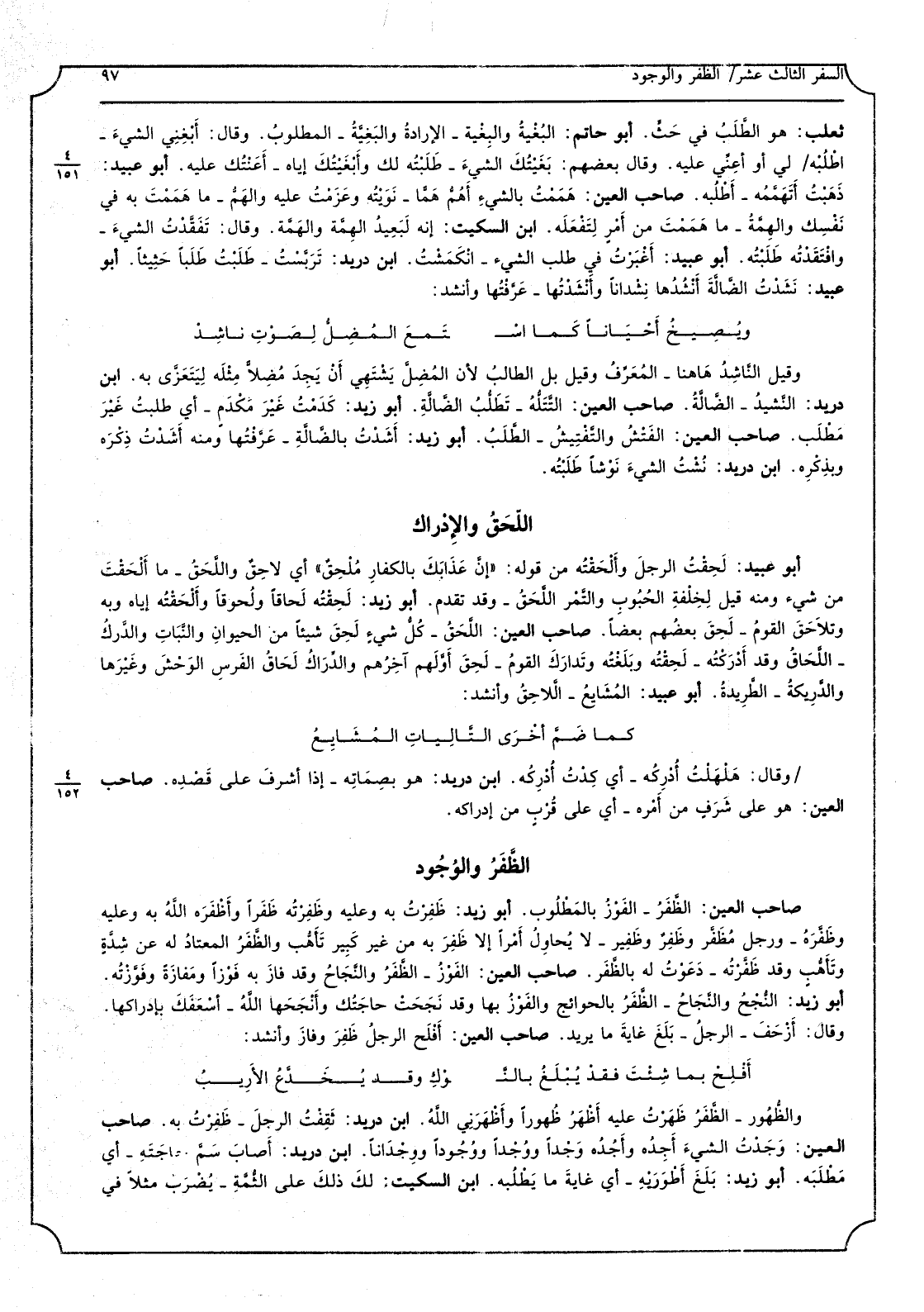 صَاحب الْعين: الظّفَر: الْفَوْز بالمطلوب. أَبُو زيد: ظَفِرت بِهِ وَعَلِيهِ وظَفِرْته ظَفَراً وأظْفَرَه الله بِهِ وَعَلِيهِ وظَفَّره، وَرجل مُظَفَّر وظَفِر وظَفير: لَا يحاول أمرا إلاّ ظفر بِهِ من غير كَبِير تأهّب وَالظفر الْمُعْتَاد لَهُ عَن شدّة وتأهّب وَقد ظَفَّرته دَعَوْت لَهُ بالظفر. صَاحب الْعين: الفَوْز: الظّفر والنّجاح وَقد فَازَ بِهِ فَوْزاً ومَفازَة وفَوَّزْته. أَبُو زيد: النّجْح والنّجاح: الظّفر بالحوائج والفوز بهَا وَقد نَجَحَتْ حَاجَتك، وأنْجَحَها الله: أسعفك بإدراكها، وَقَالَ: أزْحَف الرَّجُل: بلغ مَا يُرِيد. صَاحب الْعين: أفْلَح الرَّجُل: ظفر وفاز وَأنْشد: أفْلِحْ بِمَا شِئْت فقد يبلغ بالنّو ك وَقد يخدّع الأريب والظُّهور: الظّفر، ظَهَرْت عَلَيْهِ، أظْهَر ظُهوراً وأظْهَرني الله. ابْن دُرَيْد: ثَقِفْت الرَّجُل: ظَفرت بِهِ. صَاحب الْعين: وَجَدْت الشّيء أجِدُه وأجُدُه وَجداً ووُجْداً ووُجوداً ووِجْداناً. ابْن دُرَيْد: أصَاب سَمَّ حَاجته: أَي مطلبه. أَبُو زيد: بلغ أَطْوَرَيْه: أَي غَايَة مَا يَطْلُبهُ. ابْن السّكيت: لَك ذَلِك على الثّمَّة: يُضرب مثلا فِي