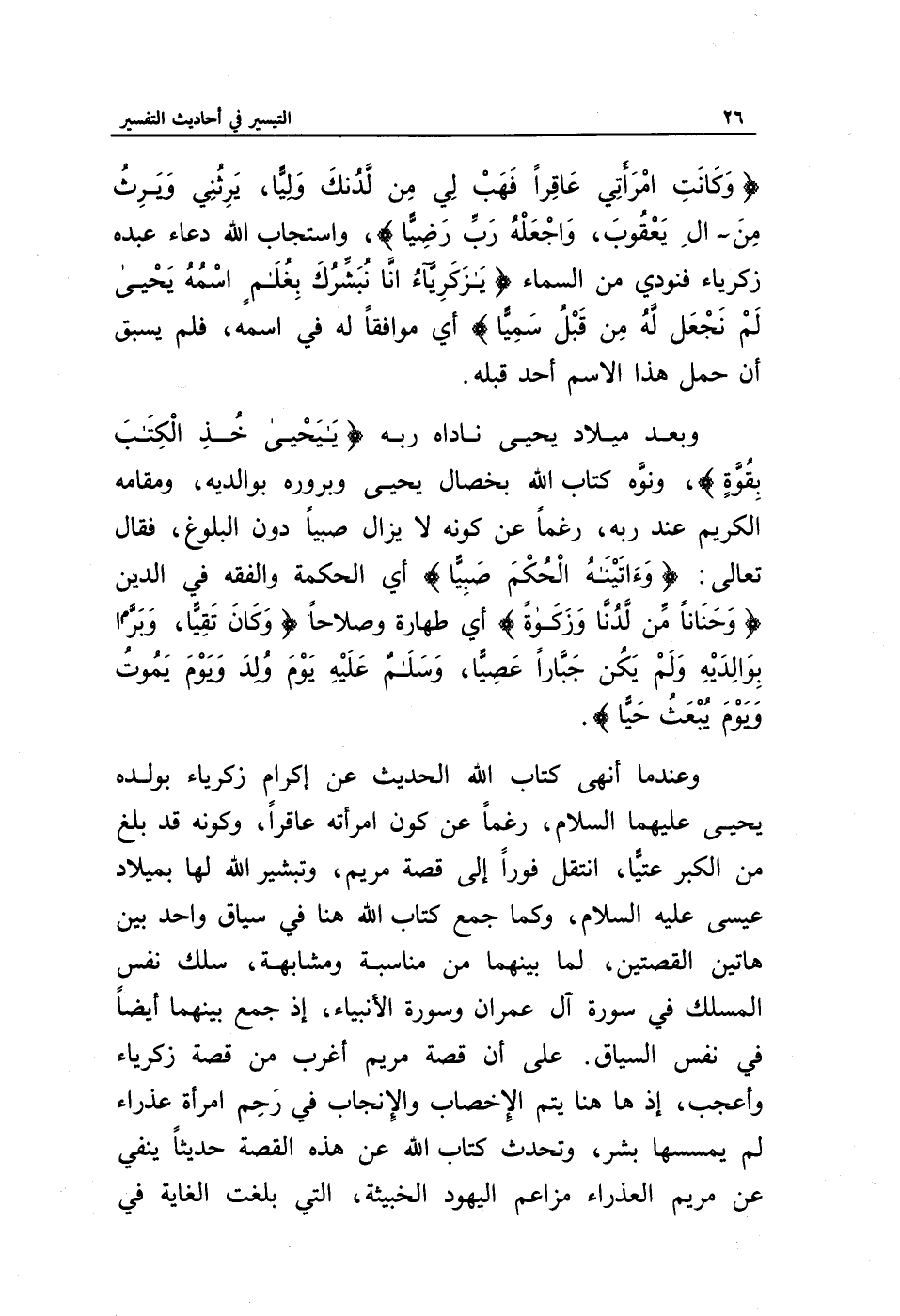 وعندما أنهى كتاب الله الحديث عن إكرام زكرياء بولده يحيى عليهما السلام، رغما عن كون امرأته عاقرا، وكونه قد بلغ من الكبر عتيا، انتقل فورا إلى قصة مريم، وتبشير الله لها بميلاد عيسى عليه السلام، وكما جمع كتاب الله هنا في سياق واحد بين هاتين القصتين، لما بينهما من مناسبة ومشابهة، سلك نفس المسلك في سورة آل عمران وسورة الأنبياء، إذ جمع بينهما أيضا في نفس السياق. على أن قصة مريم أغرب من قصة زكرياء وأعجب، إذ ها هنا يتم الإخصاب والإنجاب في رحم امرأة عذراء لم يمسسها بشر، وتحدث كتاب الله عن هذه القصة حديثا ينفي عن مريم العذراء مزاعم اليهود الخبيثة، التي بلغت الغاية في