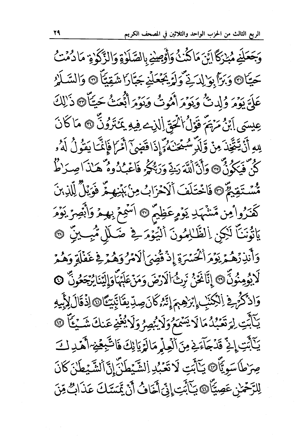 وَجَعَلَنِي مُبَارَكًا أَيْنَ مَا كُنْتُ وَأَوْصَانِي بِالصَّلَاةِ وَالزَّكَاةِ مَا دُمْتُ حَيًّا (31) وَبَرًّا بِوَالِدَتِي وَلَمْ يَجْعَلْنِي جَبَّارًا شَقِيًّا (32) وَالسَّلَامُ عَلَيَّ يَوْمَ وُلِدْتُ وَيَوْمَ أَمُوتُ وَيَوْمَ أُبْعَثُ حَيًّا (33) ذَلِكَ عِيسَى ابْنُ مَرْيَمَ قَوْلَ الْحَقِّ الَّذِي فِيهِ يَمْتَرُونَ (34) مَا كَانَ لِلَّهِ أَنْ يَتَّخِذَ مِنْ وَلَدٍ سُبْحَانَهُ إِذَا قَضَى أَمْرًا فَإِنَّمَا يَقُولُ لَهُ كُنْ فَيَكُونُ (35) وَإِنَّ اللَّهَ رَبِّي وَرَبُّكُمْ فَاعْبُدُوهُ هَذَا صِرَاطٌ مُسْتَقِيمٌ (36) فَاخْتَلَفَ الْأَحْزَابُ مِنْ بَيْنِهِمْ فَوَيْلٌ لِلَّذِينَ كَفَرُوا مِنْ مَشْهَدِ يَوْمٍ عَظِيمٍ (37) أَسْمِعْ بِهِمْ وَأَبْصِرْ يَوْمَ يَأْتُونَنَا لَكِنِ الظَّالِمُونَ الْيَوْمَ فِي ضَلَالٍ مُبِينٍ (38) وَأَنْذِرْهُمْ يَوْمَ الْحَسْرَةِ إِذْ قُضِيَ الْأَمْرُ وَهُمْ فِي غَفْلَةٍ وَهُمْ لَا يُؤْمِنُونَ (39) إِنَّا نَحْنُ نَرِثُ الْأَرْضَ وَمَنْ عَلَيْهَا وَإِلَيْنَا يُرْجَعُونَ (40) وَاذْكُرْ فِي الْكِتَابِ إِبْرَاهِيمَ إِنَّهُ كَانَ صِدِّيقًا نَبِيًّا (41) إِذْ قَالَ لِأَبِيهِ يَا أَبَتِ لِمَ تَعْبُدُ مَا لَا يَسْمَعُ وَلَا يُبْصِرُ وَلَا يُغْنِي عَنْكَ شَيْئًا (42) يَا أَبَتِ إِنِّي قَدْ جَاءَنِي مِنَ الْعِلْمِ مَا لَمْ يَأْتِكَ فَاتَّبِعْنِي أَهْدِكَ صِرَاطًا سَوِيًّا (43) يَا أَبَتِ لَا تَعْبُدِ الشَّيْطَانَ إِنَّ الشَّيْطَانَ كَانَ لِلرَّحْمَنِ عَصِيًّا (44) يَا أَبَتِ إِنِّي أَخَافُ أَنْ يَمَسَّكَ عَذَابٌ مِنَ