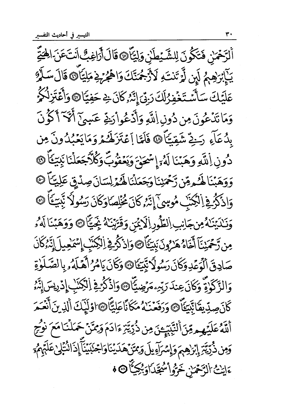 الرَّحْمَنِ فَتَكُونَ لِلشَّيْطَانِ وَلِيًّا (45) قَالَ أَرَاغِبٌ أَنْتَ عَنْ آلِهَتِي يَا إِبْرَاهِيمُ لَئِنْ لَمْ تَنْتَهِ لَأَرْجُمَنَّكَ وَاهْجُرْنِي مَلِيًّا (46) قَالَ سَلَامٌ عَلَيْكَ سَأَسْتَغْفِرُ لَكَ رَبِّي إِنَّهُ كَانَ بِي حَفِيًّا (47) وَأَعْتَزِلُكُمْ وَمَا تَدْعُونَ مِنْ دُونِ اللَّهِ وَأَدْعُو رَبِّي عَسَى أَلَّا أَكُونَ بِدُعَاءِ رَبِّي شَقِيًّا (48) فَلَمَّا اعْتَزَلَهُمْ وَمَا يَعْبُدُونَ مِنْ دُونِ اللَّهِ وَهَبْنَا لَهُ إِسْحَاقَ وَيَعْقُوبَ وَكُلًّا جَعَلْنَا نَبِيًّا (49) وَوَهَبْنَا لَهُمْ مِنْ رَحْمَتِنَا وَجَعَلْنَا لَهُمْ لِسَانَ صِدْقٍ عَلِيًّا (50) وَاذْكُرْ فِي الْكِتَابِ مُوسَى إِنَّهُ كَانَ مُخْلَصًا وَكَانَ رَسُولًا نَبِيًّا (51) وَنَادَيْنَاهُ مِنْ جَانِبِ الطُّورِ الْأَيْمَنِ وَقَرَّبْنَاهُ نَجِيًّا (52) وَوَهَبْنَا لَهُ مِنْ رَحْمَتِنَا أَخَاهُ هَارُونَ نَبِيًّا (53) وَاذْكُرْ فِي الْكِتَابِ إِسْمَاعِيلَ إِنَّهُ كَانَ صَادِقَ الْوَعْدِ وَكَانَ رَسُولًا نَبِيًّا (54) وَكَانَ يَأْمُرُ أَهْلَهُ بِالصَّلَاةِ وَالزَّكَاةِ وَكَانَ عِنْدَ رَبِّهِ مَرْضِيًّا (55) وَاذْكُرْ فِي الْكِتَابِ إِدْرِيسَ إِنَّهُ كَانَ صِدِّيقًا نَبِيًّا (56) وَرَفَعْنَاهُ مَكَانًا عَلِيًّا (57) أُولَئِكَ الَّذِينَ أَنْعَمَ اللَّهُ عَلَيْهِمْ مِنَ النَّبِيِّينَ مِنْ ذُرِّيَّةِ آدَمَ وَمِمَّنْ حَمَلْنَا مَعَ نُوحٍ وَمِنْ ذُرِّيَّةِ إِبْرَاهِيمَ وَإِسْرَائِيلَ وَمِمَّنْ هَدَيْنَا وَاجْتَبَيْنَا إِذَا تُتْلَى عَلَيْهِمْ آيَاتُ الرَّحْمَنِ خَرُّوا سُجَّدًا وَبُكِيًّا (58)