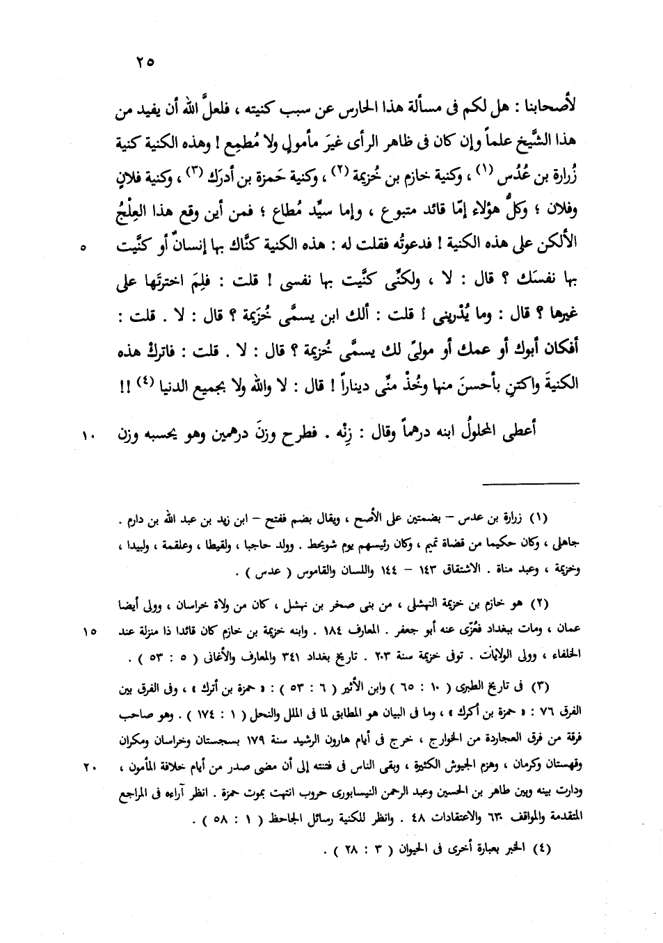 لاصحابنا هل لكم في مسألة هذا الحارس عن سبب كنيته فلعل الله يفيد من هذا الشيخ علما وان كان في ظاهر الرأي غير مامول ولا مطمع وهذه الكنية كنية زرارة بن عدس وكنية حازم بن خزيمة وكنية حمزة بن ادرك وكنية فلان وفلان وكل هؤلاء إما قائد متبوع وإما سيد مطاع ومن أين وقع هذا العلج الألكن على هذه الكنية فدعوته فقلت له هذه الكنية كناك بها انسان او كنيت بها نفسك قال لا ولكني كنيت بها نفسي قلت فلم اخترتها على غيرها قال وما يدريني قلت ألك ابن يسمى خزيمة قال لا قلت افكان ابوك او عمك او مولى لك يسمى خزيمة قال لا قلت فاترك هذه الكنية وأكتن بأحسن منها وخذ مني دينارا قال والله ولا بجميع الدنيا