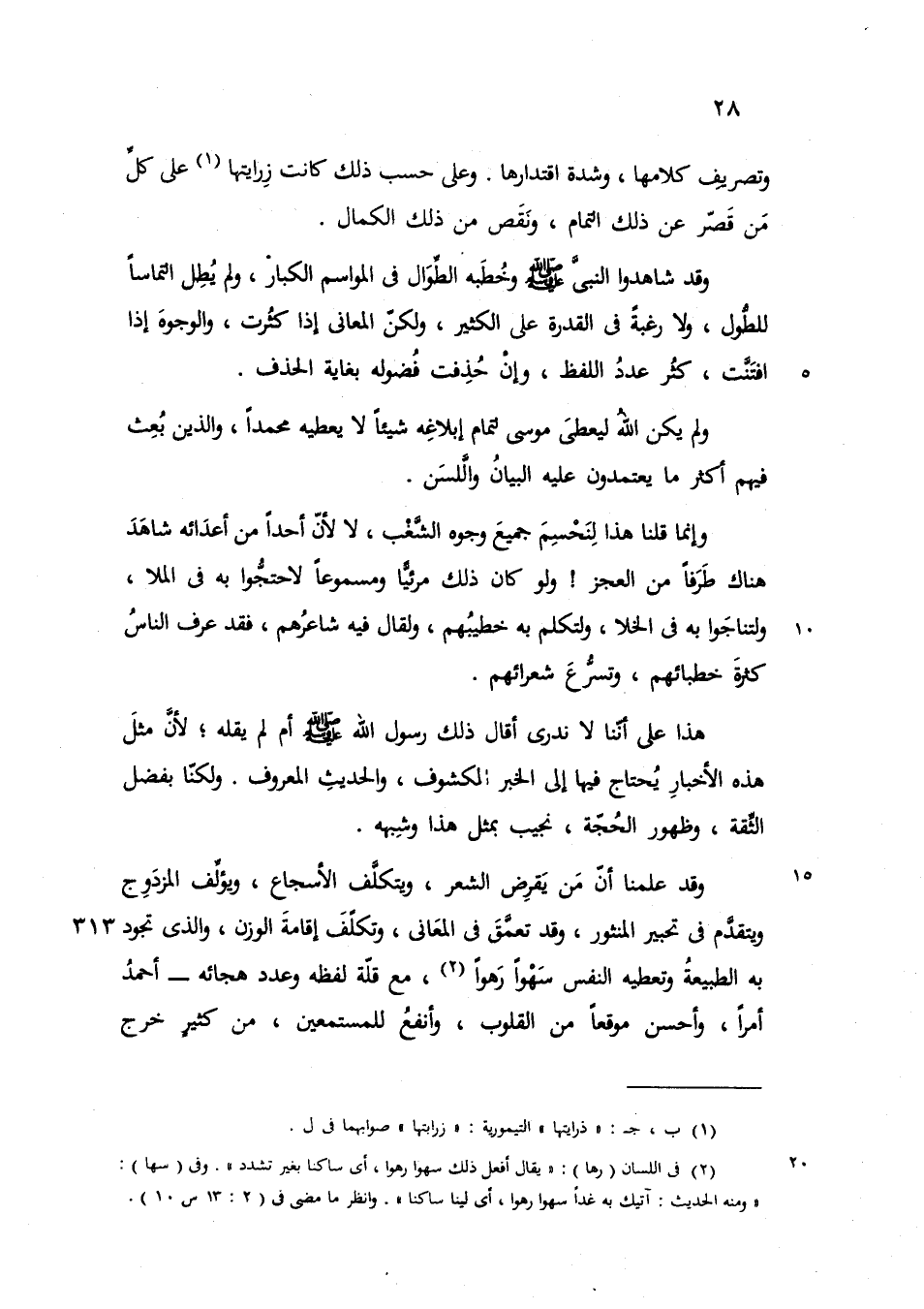 كل من قصر عن ذلك التمام ونقص من ذلك الكمال وقد شاهدوا النبي وخطبه الطوال في المواسم الكبار ولم يطل التماسا للطول ولا رغبة في القدرة على الكثير ولكن المعاني اذا كثرت والوجوه اذا أفتنت كثر عدد اللفظ وان حذفت فضوله بغاية الحذف ولم يكن الله ليعطي موسى لتمام ابلاغه شيئا لا يعطيه محمدا والذي بعث فيهم أكثر ما يعتمدون عليه البيان واللسن وإنما قلنا هذا لنحسم جميع وجوه الشغب لا ان أحدا من أعدائه شاهد هناك طرفا من العجز ولو كان ذلك مرئيا ومسموعا لاحتجوا به في الملا ولتناجوا به في الخلا ولتكلم به خطيبهم ولقال فيه شاعرهم فقد عرف الناس كثرة خطبائهم وتسرع شعرائهم