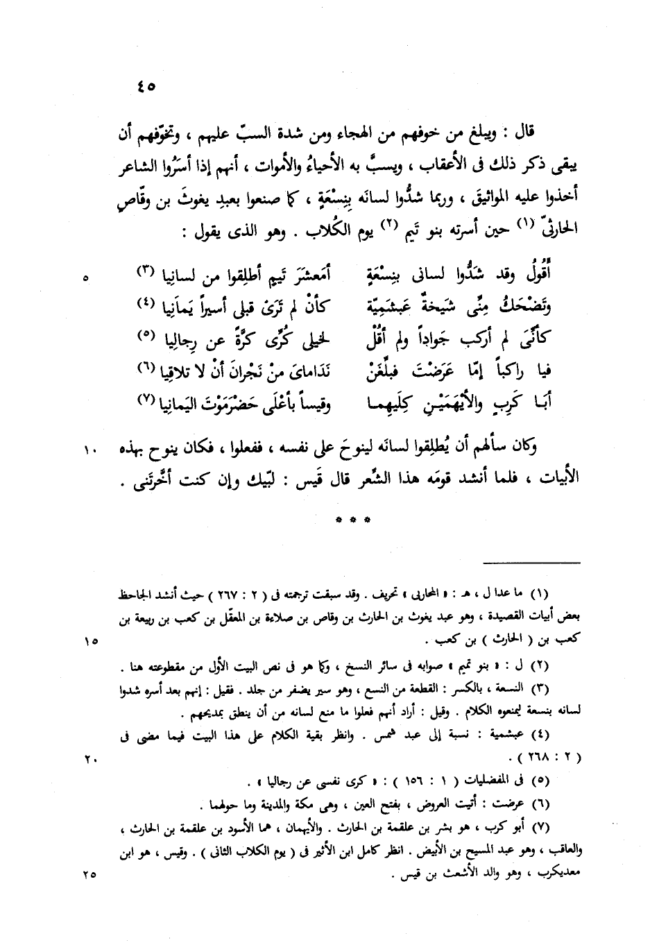 قال ويبلغ من خوفهم من الهجاء ومن شدة السب عليهم وتخوفهم ان يبقى ذكر ذلك في الاعقاب ويسب به الاحياء والاموات أنهم اذا أسروا الشاعر أخذوا عليه المواثيق وربما شدوا لسانه بنسعة كما صنعوا بعبد يغوث ابن وقاص المحاربي حين أسرته بنو تيم يوم الكلاب وهو الذي يقول