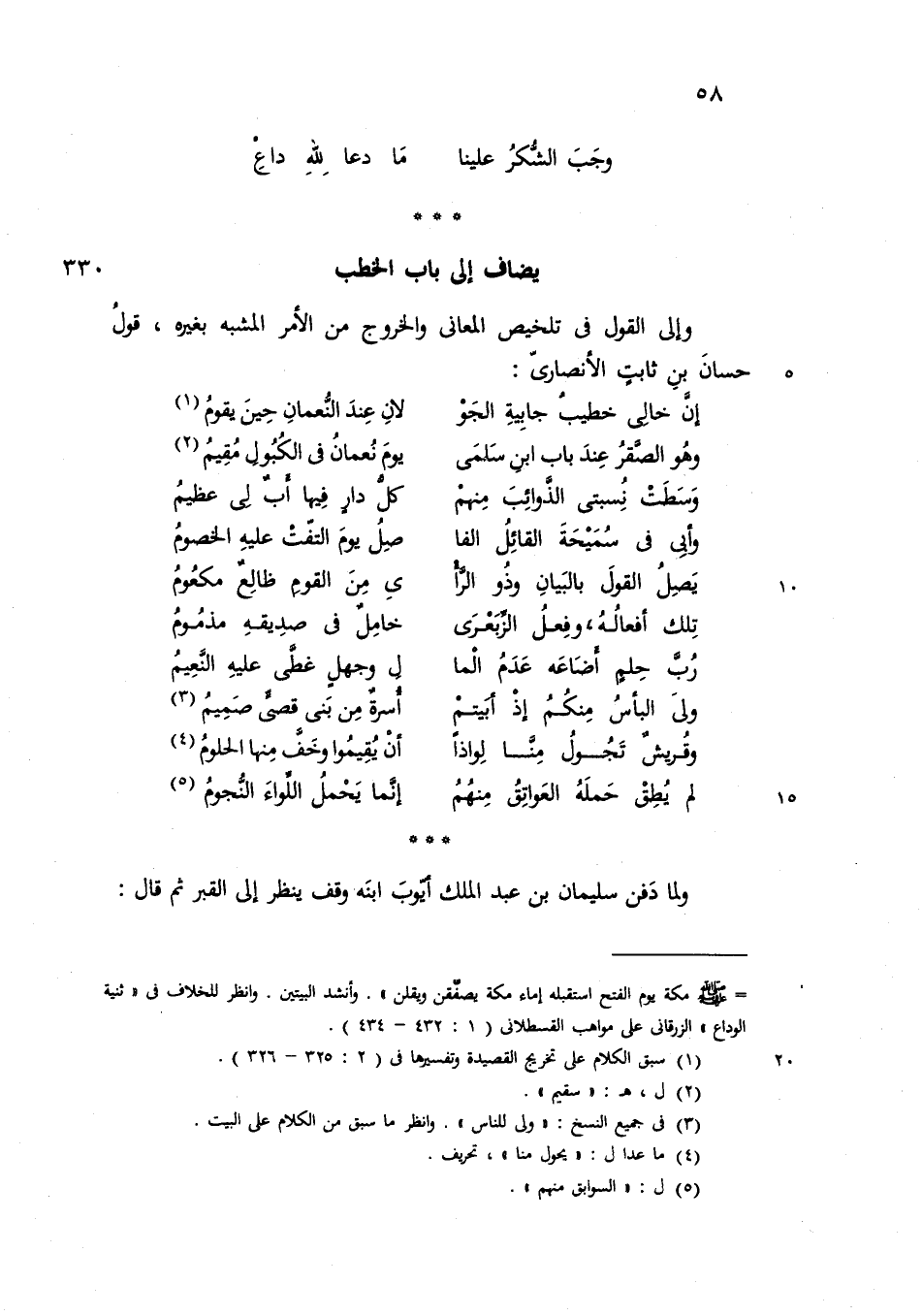 يضاف الى باب الخطب والى القول في تلخيص المعاني والخروج من الامر المشبه بغيره قول حسان بن ثابت