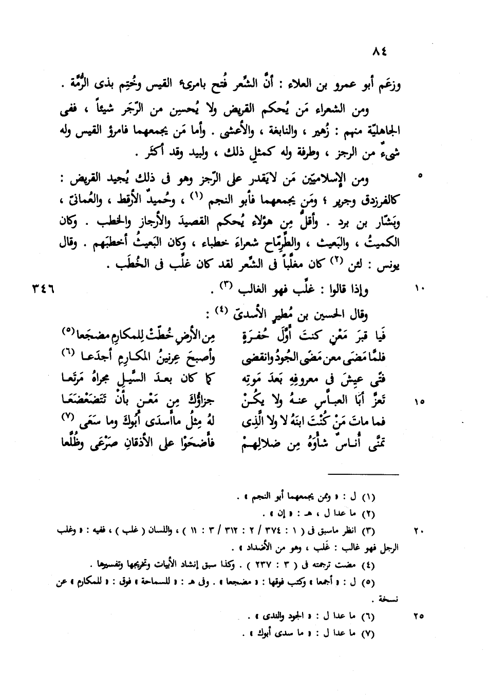 ومن الشعراء من يحكم القريض ولا يحسن من الرجز شيئا ففي الجاهلية منهم زهير والنابغة والاعشى واما من يجمعهما فامرؤ القيس وله شيء من الرجز وطرفة وله كمثل ذلك ولبيد وقد اكثر ومن الاسلاميين من لا يقدر على الرجز وهو في ذلك يجيد القريض كالفرزدق وجرير ومن يجمعهما كأبي النجم وحميد الارقط والعماني وبشار بن برد وأقل من هؤلاء يحكم القصيد والارجاز و الخطب وكان الكميت والبعيث والطرماح شعراء خطباء وكان البعيث اخطبهم وقال يونس ان كان مغلبا في الشعر لقد كان غلب في الخطب واذا قالوا غلب فهوالغالب