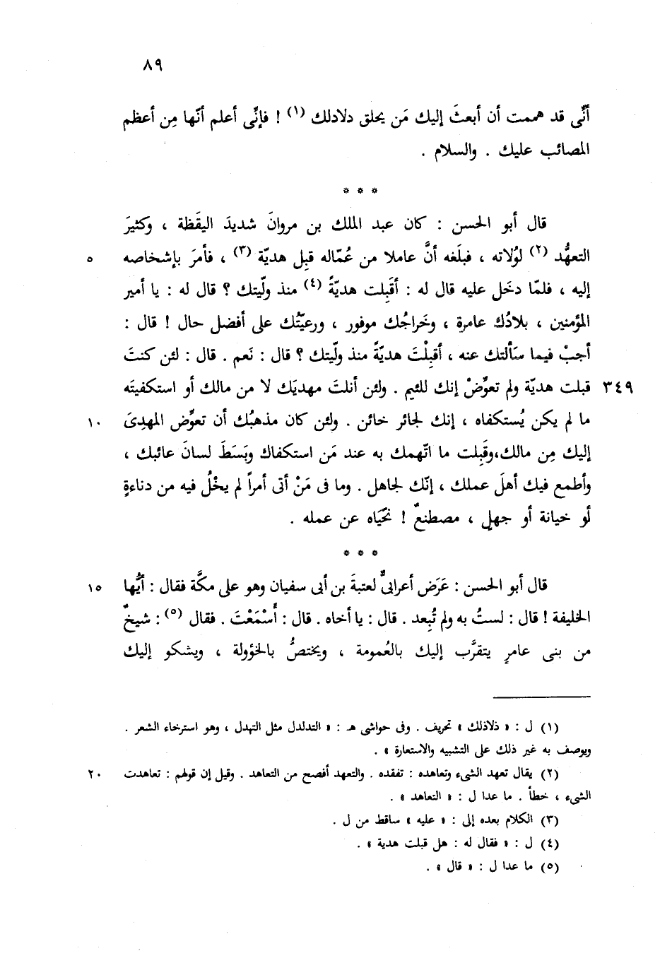 قال ابو الحسن كان عبدالملك بن مروان شديد اليقظة كثير التعاهد لولاته فبلغه ان عاملا من عماله قبل هدية فأمر باشخاصه اليه فلما دخل عليه قال له أقبلت هدية منذ وليتك قال يا أميرالمؤمنين بلادك عامرة وخراجك موفور ورعيتك على افضل حال قال أجب فيما سألتك عنه أقبلت هدية منذ وليتك قال نعم قال لئن كنت قلت ولم تعوض انك للئيم ولئن أنلت مهديك لا من مالك او استكفيته ما لم يكن يستكفاه انك لجائر خائن ولئن كان مذهبك ان تعوض المهدى اليك من مالك وقبلت ما اتهمك به عند من استكفاك وبسط لسان عائبك وأطمع اهل عملك انك لجاهل وما فيمن اتى امرا لم يخل فيه من دناءة او خيانة او جهل مصطنع نحياه عن عمله