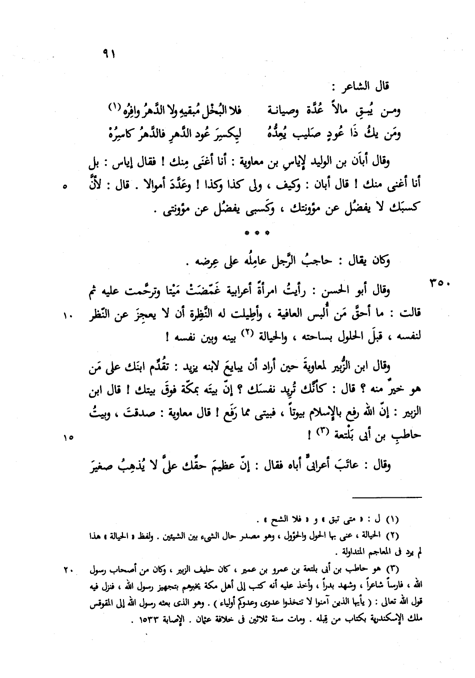 وقال ابان بن الوليد لإياس بن معاوية انا اغنى منك فقال إياس بل أنا اغنى منك قال أبان وكيف ولي كذا وكذا وعدد أموالا قال ان كسبك لا يفضل عن مؤونتك وكسبي يفضل عن مؤونتي