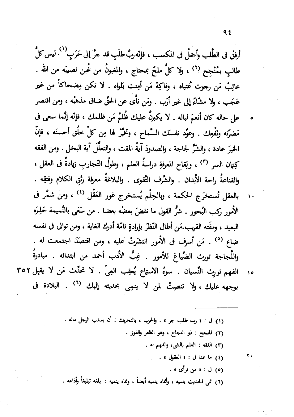 أرفق في الطلب وأجمل في المكسب فانه رب طلب قد جر الىحرب ليس كل طالب بمنجح ولا كل ملح بمحتاج والمغبون من غبن نصيبه من الله عاتب من رجوت عتباه وفاكه من أمنت بلواه لا تكن مضحاكا من غير عجب ولا مشاء الى غير أرب ومن نأى عن الحق أضاق مذهبه ومن اقتصر على حاله كان أنعم لباله لا يكبرن عليك ظلم من ظلمك فانه أنما سعى في مضرته ونفعك وعود نفسك السماح وتخير لها من كل خلق أحسنه فان الخير عادة والشر لجاجة والصدود آية المقت والتعلل آية البخل ومن الثقة كتمان السر ولقاح المعرفة دراسة العلم وطول التجارب زيادة في العقل والقناعة راحة الابدان والشرف التقوى والبلاغة معرفة رتق الكلام وفتقه بالعقل تستخرج الحكمة وبالحلم يستخرج غور العقل ومن شمر في الامور ركب البحور شر القول ما نقض بعضه بعضا ومن سعى بالنميمة حذره البعيد ومقته القريب من أطال النظر بإرادة تامة أدرك الغاية ومن تواني في نفسه ضاع من أسرف في الامور انتشرت عليه ومن اقتصد اجتمعت له واللجاجة تورث الضياع للأمور غب الادب احمد من ابتدائه مبادرة الفهم تورث النسيان سوء الاستماع يعقب العي لا تحدث من لا يقبل بوجهه عليك ولا تنصت لمن لا ينمى بحديثه اليك البلادة @