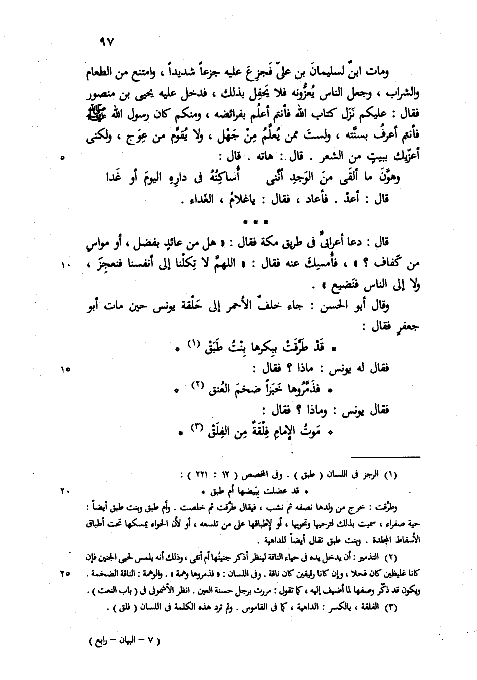 ومات ابن لسليمان بن علي فجزع عليه جزعا شديدا وامتنع من الطعام والشراب وجعل الناس يعزونه فلا يحفل بذلك فدخل عليه يحيى بن منصور فقال عليكم نزل كتاب الله فانتم أعلم بفرائضه ومنكم كان رسول الله فأنتم أعرف بسنته ولست ممن يعلم من جهل ولا يقوم من عوج ولكني أعزيك ببيت من شعر قال هاته قال