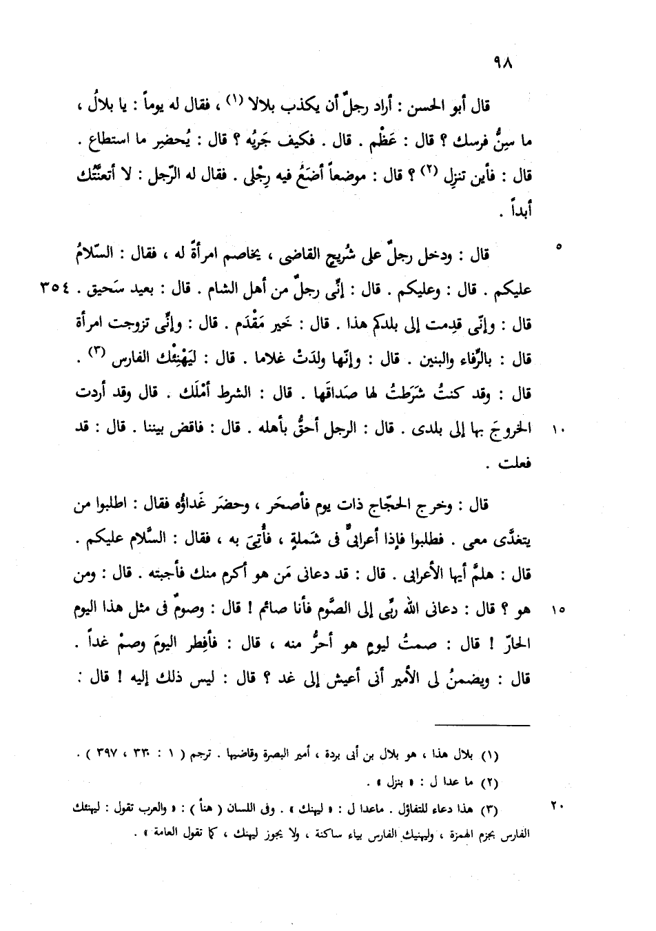 قال ابوالحسن أراد رجل ان يكذب بلالا فقال له يوما يا بلال ما سن فرسك قال عظم قال فكيف جريه قال يحضر ما استطاع قال فأين ينزل قال موضعا أضع فيه رجلي فقال له الرجل لا أتعنتك ابدا