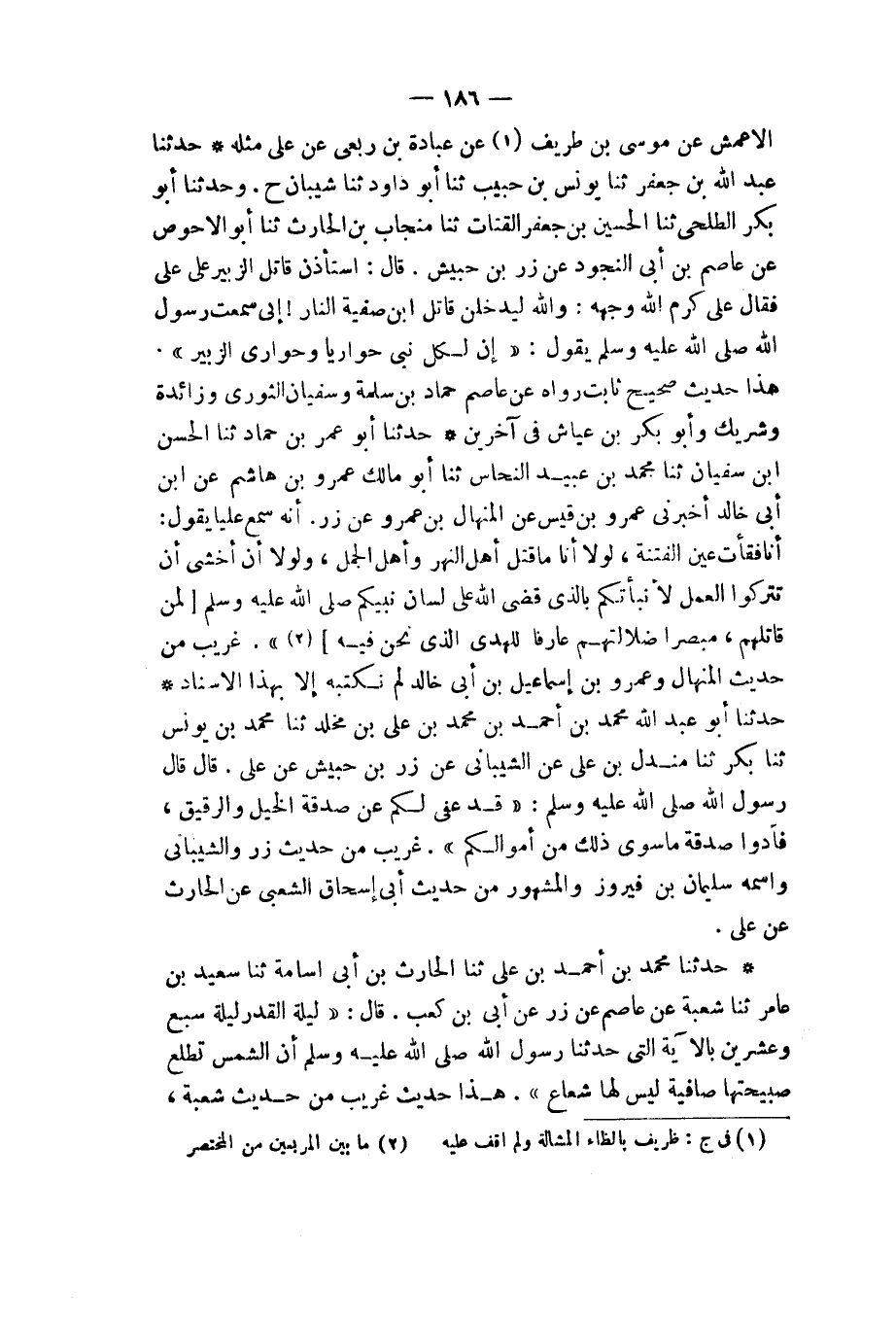 حَدَّثَنَا عَبْدُ اللهِ بْنُ جَعْفَرٍ، ثنا يُونُسُ بْنُ حَبِيبٍ، ثنا أَبُو دَاوُدَ، ثنا شَيْبَانُ، ح. وَحَدَّثَنَا أَبُو بَكْرٍ الطَّلْحِيُّ، ثنا الْحُسَيْنُ بْنُ جَعْفَرٍ الْقَتَّاتُ، ثنا مِنْجَابُ بْنُ الْحَارِثِ، ثنا أَبُو الْأَحْوَصِ، عَنْ عَاصِمِ بْنِ أَبِي النَّجُودِ، عَنْ زِرِّ بْنِ حُبَيْشٍ، قَالَ: اسْتَأْذَنَ قَاتِلُ الزُّبَيْرِ عَلَى عَلِيٍّ، فَقَالَ عَلِيٌّ كَرَّمَ اللهُ وَجْهَهُ: وَاللهِ لَيَدْخُلَنَّ قَاتَلُ ابْنِ صَفِيَّةَ النَّارَ، إِنِّي سَمِعْتُ رَسُولَ اللهِ صَلَّى اللهُ عَلَيْهِ وَسَلَّمَ يَقُولُ: «إِنَّ §لِكُلِّ نَبِيٍّ حَوَارِيًّا، وَحَوَارِيَّ الزُّبَيْرُ». هَذَا حَدِيثٌ صَحِيحٌ ثَابِتٌ. رَوَاهُ عَنْ عَاصِمٍ، حَمَّادُ بْنُ سَلَمَةَ، وَسُفْيَانُ الثَّوْرِيُّ، وَزَائِدَةُ، وَشَرِيكٌ، وَأَبُو بَكْرِ بْنُ عَيَّاشٍ فِي آخَرِينَ