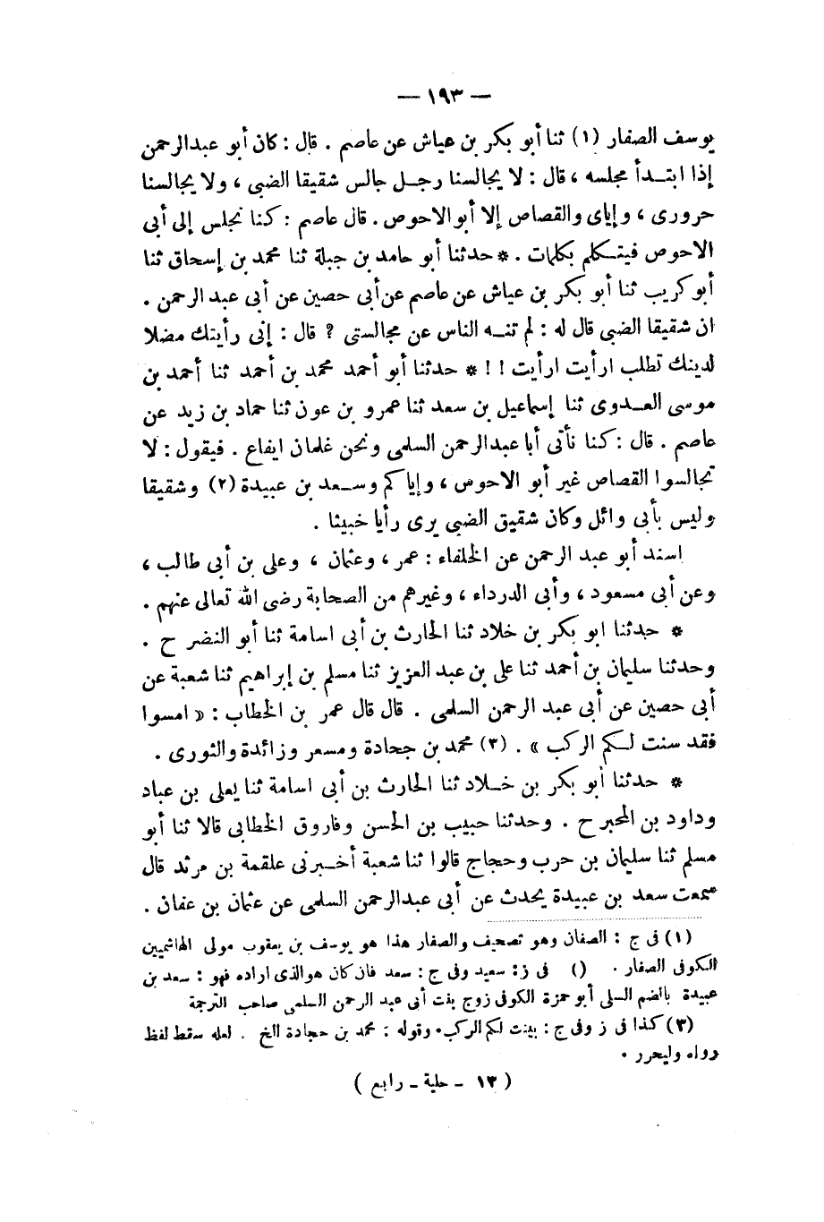 حَدَّثَنَا أَبُو أَحْمَدَ مُحَمَّدُ بْنُ أَحْمَدَ، ثنا أَحْمَدُ بْنُ مُوسَى الْعَدَوِيُّ، ثنا إِسْمَاعِيلُ بْنُ سَعْدٍ، ثنا عَمْرُو بْنُ عَوْنٍ، ثنا حَمَّادُ بْنُ زَيْدٍ، عَنْ عَاصِمٍ، قَالَ: كُنَّا نَأْتِي أَبَا عَبْدِ الرَّحْمَنِ السُّلَمِيَّ وَنَحْنُ غِلْمَانٌ أَيْفَاعٌ، فَيَقُولُ: «§لَا تُجَالِسُوا الْقُصَّاصَ غَيْرَ أَبِي الْأَحْوَصِ، وَإِيَّاكُمْ وَسَعْدَ بْنَ عُبَيدَةَ، وَشَقِيقًا». وَلَيْسَ بِأَبِي وَائِلٍ، وَكَانَ شَقِيقٌ الضَّبِّيُّ يَرَى رَأَيًا خَبِيثًا. أَسْنَدَ أَبُو عَبْدِ الرَّحْمَنِ عَنِ الْخُلَفَاءِ: عُمَرَ، وَعُثْمَانَ، وَعَلِيِّ بْنِ أَبِي طَالِبٍ وَعَنْ أَبِي مَسْعُودٍ، وَأَبِي الدَّرْدَاءِ، وَغَيْرِهِمْ مِنَ الصَّحَابَةِ رَضِيَ اللهُ تَعَالَى عَنْهُمْ