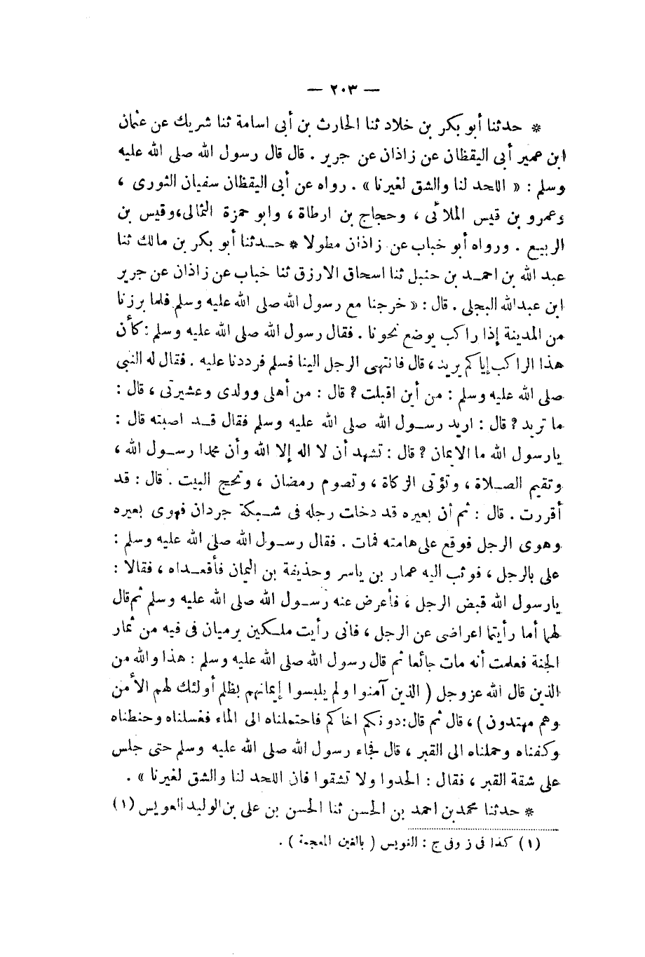 حَدَّثَنَا أَبُو بَكْرِ بْنُ مَالِكٍ، ثَنَا عَبْدُ اللهِ بْنُ أَحْمَدَ بْنِ حَنْبَلٍ، ثَنَا إِسْحَاقُ الْأَزْرَقُ، ثَنَا خَبَّابٌ، عَنْ زَاذَانَ، عَنْ جَرِيرِ بْنِ عَبْدِ اللهِ الْبَجَلِيِّ، قَالَ: خَرَجْنَا مَعَ رَسُولِ اللهِ صَلَّى اللهُ عَلَيْهِ وَسَلَّمَ فَلَمَّا بَرَزْنَا مِنَ الْمَدِينَةَ إِذَا رَاكِبٌ يُوضَعُ نَحْوَنَا فَقَالَ رَسُولُ اللهِ صَلَّى اللهُ عَلَيْهِ وَسَلَّمَ: «كَأَنَّ هَذَا الرَّاكِبُ إِيَّاكُمْ يُرِيدُ». قَالَ: فَانْتَهَى الرَّاكِبُ إِلَيْنَا فَسَلَّمَ فَرَدَدْنَا عَلَيْهِ فَقَالَ لَهُ النَّبِيُّ صَلَّى اللهُ عَلَيْهِ وَسَلَّمَ: «مِنْ أَيْنَ أَقْبَلَتَ؟» قَالَ: مِنْ أَهْلِي وَوَلَدِي وَعَشِيرَتِي. قَالَ: «مَا تُرِيدُ؟» قَالَ: أُرِيدُ رَسُولَ اللهِ صَلَّى اللهُ عَلَيْهِ وَسَلَّمَ. فَقَالَ: «قَدْ أَصَبْتُهُ» قَالَ: يَا رَسُولَ اللهِ، مَا الْإِيمَانُ؟ قَالَ: «تَشْهَدُ أَنْ لَا إِلَهَ إِلَّا اللهُ، وَأَنَّ مُحَمَّدًا رَسُولُ اللهِ، وَتُقِيمُ الصَّلَاةَ، وَتُؤْتِي الزَّكَاةَ، وَتَصُومُ رَمَضَانَ، وَتَحُجُّ الْبَيْتَ» قَالَ: قَدْ أَقْرَرْتَ. قَالَ: ثُمَّ إِنَّ بَعِيرَهُ قَدْ دَخَلَتْ رِجْلُهُ فِي شَبَكَةِ جِرْذَانَ فَهَوَى بَعِيرُهُ وَهَوَى الرَّجُلُ فَوَقَعَ عَلَى هَامَتِهِ فَمَاتَ فَقَالَ رَسُولُ اللهِ صَلَّى اللهُ عَلَيْهِ وَسَلَّمَ: «عَلَيَّ بِالرَّجُلِ»، فَوَثَبَ إِلَيْهِ عَمَّارُ بْنُ يَاسِرٍ وَحُذَيْفَةُ بْنُ الْيَمَانِ فَأَقْعَدَاهُ، فَقَالَا: يَا رَسُولَ اللهِ، قُبِضَ الرَّجُلُ. فَأَعْرَضَ عَنْهُ رَسُولُ اللهِ صَلَّى اللهُ عَلَيْهِ وَسَلَّمَ ثُمَّ قَالَ لَهُمَا: «أَمَا رَأَيْتُمَا إِعْرَاضِي عَنْ هَذَا الرَّجُلِ، فَإِنِّي رَأَيْتُ مَلَكَيْنِ يَرْمِيَانِ فِي فِيهِ مِنْ ثِمَارِ الْجَنَّةِ، فَعَلِمْتُ أَنَّهُ مَاتَ جَائِعًا» ثُمَّ قَالَ رَسُولُ اللهِ صَلَّى اللهُ عَلَيْهِ وَسَلَّمَ: " هَذَا وَاللهِ مِنَ الَّذِينَ قَالَ اللهُ عَزَّ وَجَلَّ {الَّذِينَ آمَنُوا وَلَمْ يَلْبِسُوا إِيمَانَهُمْ بِظُلْمٍ أُولَئِكَ لَهُمُ الْأَمْنُ وَهُمْ مُهْتَدُونَ} [الأنعام: 82] " قَالَ: ثُمَّ قَالَ: «دُونَكُمْ أَخَاكُمْ» فَاحْتَمَلْنَاهُ إِلَى الْمَاءِ فَغَسَّلْنَاهُ وَحَنَّطْنَاهُ وَكَفَّنَّاهُ وَحَمَلْنَاهُ إِلَى الْقَبْرِ، قَالَ: فَجَاءَ رَسُولُ اللهِ صَلَّى اللهُ عَلَيْهِ وَسَلَّمَ حَتَّى جَلَسَ عَلَى شُقَّةِ الْقَبْرِ فَقَالَ: «§أَلْحِدُوا وَلَا تَشُقُّوا؛ فَإِنَّ اللَّحْدَ لَنَا وَالشَّقَّ لِغَيْرِنَا»