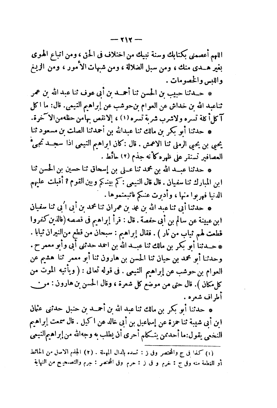 حَدَّثَنَا أَبُو بَكْرِ بْنُ مَالِكٍ، ثَنَا عَبْدُ اللهِ بْنُ أَحْمَدَ بْنِ حَنْبَلٍ، حَدَّثَنِي عُثْمَانُ بْنُ أَبِي شَيْبَةَ، ثَنَا حَمْزَةُ، عَنْ إِسْمَاعِيلَ بْنِ أَبِي خَالِدٍ، عَنْ أَكِيلٍ، قَالَ: سَمِعْتُ إِبْرَاهِيمَ النَّخَعِيَّ، يَقُولُ: «§مَا أَحَدٌ مِمَّنْ يَتَكَلَّمُ أَحْرَى أَنْ يُطْلَبَ بِهِ وَجْهُ اللهِ مِنْ إِبْرَاهِيمَ التَّيْمِيِّ -[213]-، وَلَوَدِدْتُ أَنَّهُ انْفَلَتَ مِنْهُ كَفَافًا»