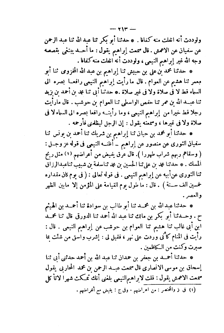 حَدَّثَنَا أَبِي، ثَنَا مُحَمَّدُ بْنُ أَحْمَدَ بْنِ يَزِيدَ، ثَنَا عَبْدُ اللهِ بْنُ عُمَرَ، ثَنَا حَفْصٌ الْوَاسِطِيُّ، ثَنَا الْعَوَّامُ بْنُ حَوْشَبٍ، قَالَ: «§مَا رَأَيْتُ رَجُلًا قَطُّ خَيْرًا مِنْ إِبْرَاهِيمَ التَّيْمِيِّ، وَمَا رَأَيْتُهُ رَافِعًا بَصَرَهُ إِلَى السَّمَاءِ، لَا فِي صَلَاةٍ وَلَا فِي غَيْرِهَا»