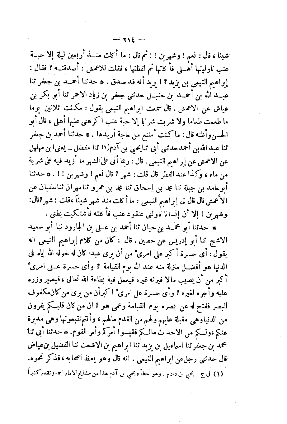حَدَّثَنَا أَحْمَدُ بْنُ جَعْفَرٍ، ثَنَا عَبْدُ اللهِ بْنُ أَحْمَدَ، حَدَّثَنِي أَبِي، ثَنَا يَحْيَى بْنُ آدَمَ، ثنا مُفَضَّلٌ يَعْنِي ابْنَ مُهَلْهَلٍ عَنِ الْأَعْمَشِ، عَنْ إِبْرَاهِيمَ التَّيْمِيِّ، قَالَ: «§رُبَّمَا أَتَى عَلَيَّ الشَّهْرُ مَا أَزِيدُ فِيهِ عَلَى شَرْبَةٍ مِنْ مَاءٍ وَكَذَا عِنْدَ الْفِطْرِ» قَالَ: قُلْتُ: شَهْرٌ. قَالَ: «نَعَمْ، وَشَهْرَيْنِ»