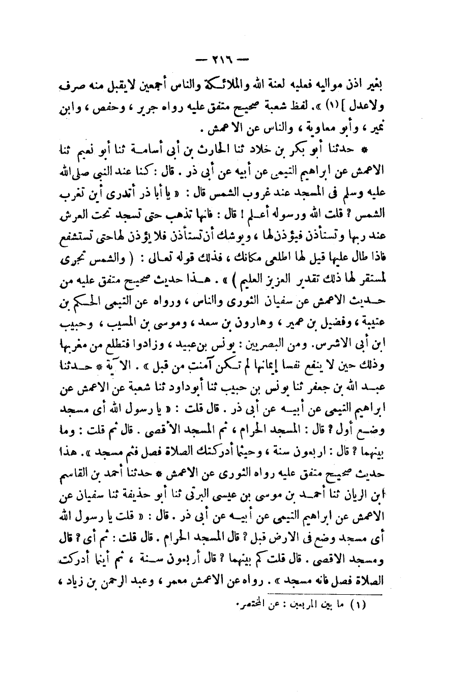 حَدَّثَنَا أَحْمَدُ بْنُ الْقَاسِمِ بْنِ الرَّيَّانِ، ثَنَا أَحْمَدُ بْنُ مُوسَى بْنِ عِيسَى الْبِرْتِيُّ، ثَنَا أَبُو حُذَيْفَةَ، ثَنَا سُفْيَانُ، عَنِ الْأَعْمَشِ، عَنْ إِبْرَاهِيمَ التَّيْمِيِّ، عَنْ أَبِيهِ، عَنْ أَبِي ذَرٍّ، قَالَ: قُلْتُ: يَا رَسُولَ اللهِ، §أَيُّ مَسْجِدٍ وُضِعَ فِي الْأَرْضِ قَبْلُ؟ قَالَ: «الْمَسْجِدُ الْحَرَامُ» قَالَ: قُلْتُ: ثُمَّ أَيُّ؟ قَالَ: «وَمَسْجِدُ الْأَقْصَى» قَالَ: قُلْتُ: كَمْ بَيْنَهُمَا؟ قَالَ: «أَرْبَعُونَ سَنَةً، ثُمَّ أَيْنَمَا أَدْرَكْتَ الصَّلَاةَ فَصَلِّ فَإِنَّهُ مَسْجِدٌ». رَوَاهُ عَنِ الْأَعْمَشِ مَعْمَرٌ، وَعَبْدُ الرَّحْمَنِ بْنُ زِيَادٍ -[217]-، وَأَبُو عَوَانَةَ، وَحَفْصُ بْنُ غِيَاثٍ، وَعِيسَى بْنُ يُونُسَ، وَجَرِيرٌ، وَالنَّاسُ. وَرَوَاهُ عَبْدُ الْأَعْلَى عَنْ إِبْرَاهِيمَ التَّيْمِيِّ. حَدَّثَنَا أَبُو بَكْرِ بْنُ خَلَّادٍ، ثَنَا مُحَمَّدُ بْنُ عُثْمَانَ بْنِ أَبِي شَيْبَةَ، ثَنَا مُحَمَّدُ بْنُ إِبْرَاهِيمَ بْنِ مَيْمُونٍ، ثَنَا دَاوُدُ بْنُ الزِّبْرِقَانِ، عَنْ عَبْدِ الْأَعْلَى، عَنْ إِبْرَاهِيمَ التَّيْمِيِّ، عَنْ أَبِيهِ، عَنْ أَبِي ذَرٍّ، قَالَ: سَأَلْتُ رَسُولَ اللهِ صَلَّى اللهُ عَلَيْهِ وَسَلَّمَ: أَيُّ مَسْجِدٍ وُضِعَ لِلنَّاسِ أَوَّلًا؟ فَذَكَرَ نَحْوَهُ
