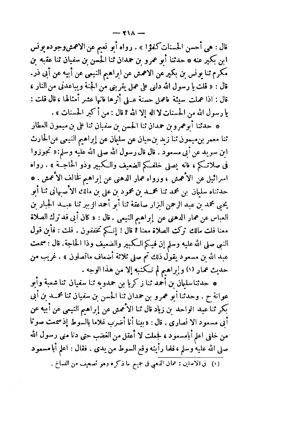 حَدَّثَنَاهُ سُلَيْمَانُ بْنُ مُحَمَّدٍ، ثَنَا مُحَمَّدُ بْنُ مَحْمُودِ بْنِ عَلِيِّ بْنِ مَالِكٍ الْأَصْبَهَانِيُّ، ثَنَا أَبُو يَحْيَى مُحَمَّدُ بْنُ عَبْدِ الرَّحِيمِ الْبَزَّارُ صَاعِقَةُ، ثَنَا أَبُو أَحْمَدَ الزُّبَيْرُ، ثَنَا عَبْدُ الْجَبَّارِ بْنُ الْعَبَّاسِ، عَنْ عَمَّارٍ الدُّهْنِيِّ، عَنْ إِبْرَاهِيمَ التَّيْمِيِّ، قَالَ: كَانَ أَبِي قَدْ تَرَكَ الصَّلَاةَ مَعَنَا، قُلْتُ: «مَا لَكَ تَرَكْتَ الصَّلَاةَ مَعَنَا؟» قَالَ: «إِنَّكُمْ تُخَفِّفُونَ». قُلْتُ: فَأَيْنَ قَوْلُ النَّبِيِّ صَلَّى اللهُ عَلَيْهِ وَسَلَّمَ: «إِنَّ §فِيكُمُ الْكَبِيرَ وَالضَّعِيفَ وَذَا الْحَاجَةِ». قَالَ: سَمِعْتُ عَبْدَ اللهِ بْنَ مَسْعُودٍ يَقُولُ ذَلِكَ ثُمَّ صَلَّى ثَلَاثَةَ أَضْعَافِ مَا تُصَلُّونَ. غَرِيبٌ مِنْ حَدِيثِ عَمَّارٍ وَإِبْرَاهِيمَ، لَمْ نَكْتُبْهُ إِلَّا مِنْ هَذَا الْوَجْهِ
