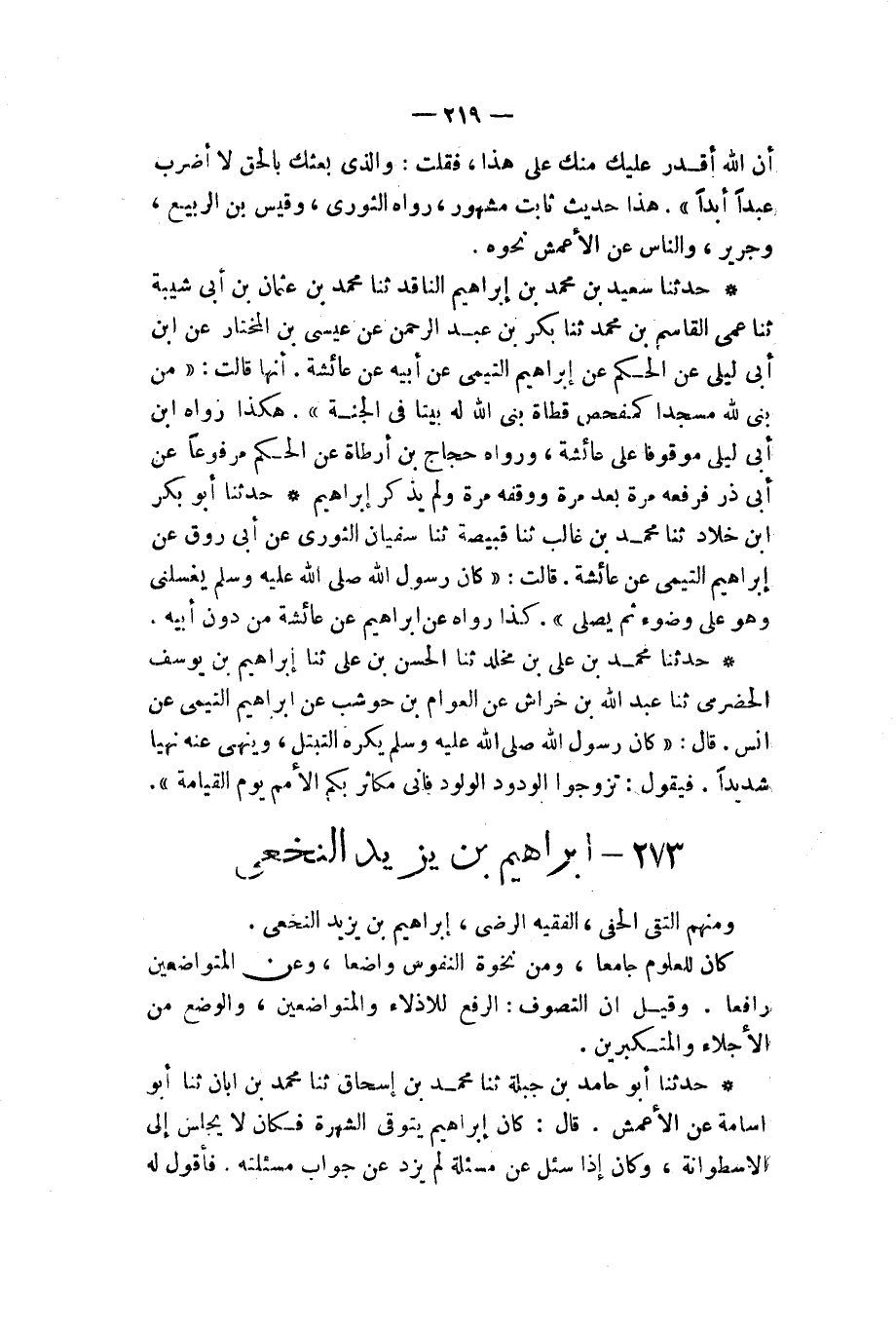 §إِبْرَاهِيمُ بْنُ يَزِيدَ النَّخَعِيُّ وَمِنْهُمُ التَّقِيُّ الْحَفِيُّ، الْفَقِيهُ الرَّضِيُّ: إِبْرَاهِيمُ بْنُ يَزِيدَ النَّخَعِيُّ. كَانَ لِلْعُلُومِ جَامِعًا، وَمِنْ نَخْوَةِ النُّفُوسِ وَاضِعًا، وَعَنِ الْمُتَوَاضِعِينَ رَافِعًا. وَقِيلَ: إِنَّ التَّصَوُّفَ الرَّفْعُ لِلْأَذِلَّاءِ وَالْمُتَوَاضِعِينَ، وَالْوَضْعُ مِنَ الْأَجِلَّاءِ وَالْمُتَكَبِّرِينَ
