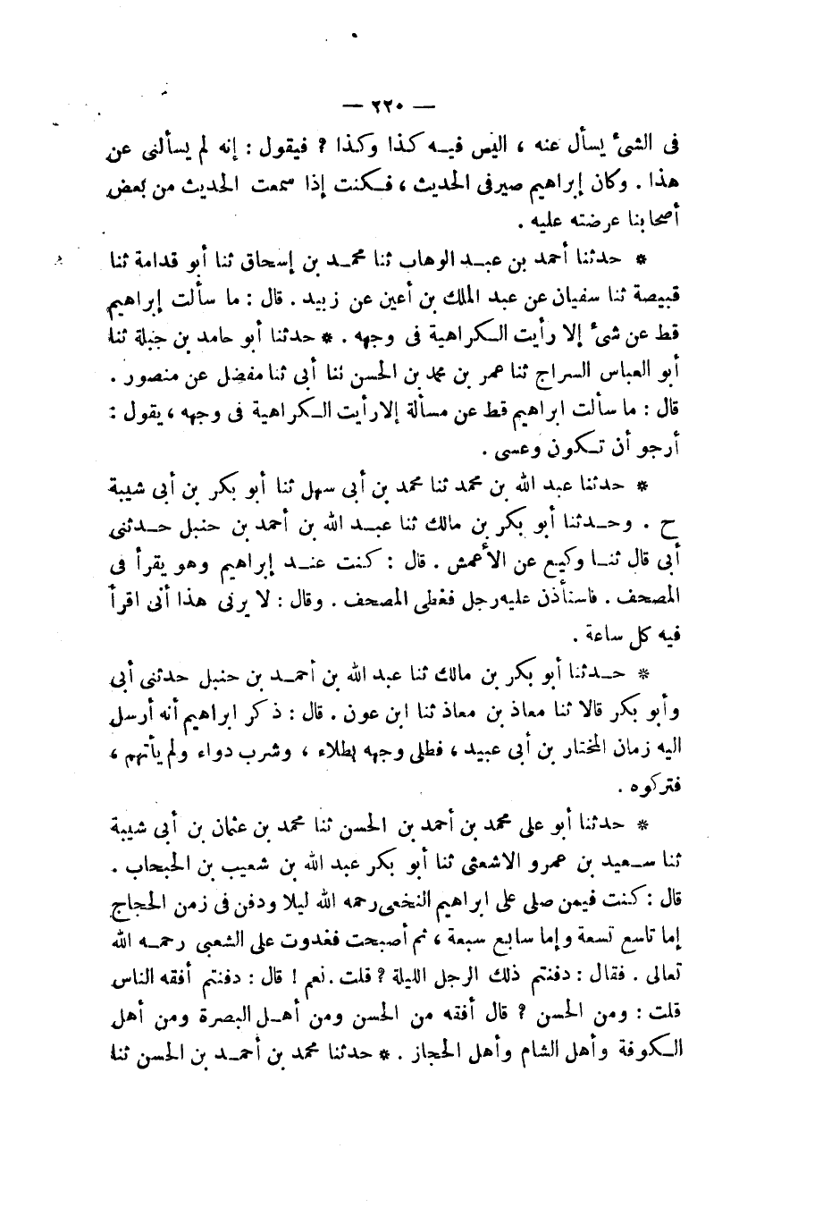 حَدَّثَنَا عَبْدُ اللهِ بْنُ مُحَمَّدٍ، ثَنَا مُحَمَّدُ بْنُ أَبِي سَهْلٍ، ثَنَا أَبُو بَكْرِ بْنُ أَبِي شَيْبَةَ، ح. وَحَدَّثَنَا أَبُو بَكْرِ بْنُ مَالِكٍ، ثَنَا عَبْدُ اللهِ بْنُ أَحْمَدَ بْنِ حَنْبَلٍ، حَدَّثَنِي أَبِي قَالَ: ثَنَا وَكِيعٌ، عَنِ الْأَعْمَشِ، قَالَ: كُنْتُ عِنْدَ إِبْرَاهِيمَ وَهُوَ يَقْرَأُ فِي الْمُصْحَفِ، فَاسْتَأْذَنَ عَلَيْهِ رَجُلٌ، فَغَطَّى الْمُصْحَفَ، وَقَالَ: «§لَا يَرَانِي هَذَا أَنِّي أقْرَأُ فِيهِ كُلَّ سَاعَةٍ»