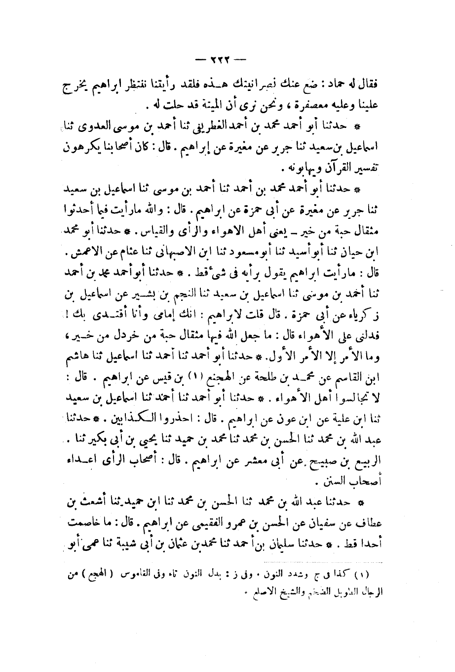 حَدَّثَنَا أَبُو أَحْمَدَ مُحَمَّدُ بْنُ أَحْمَدَ، ثنا أَحْمَدُ بْنُ مُوسَى، ثنا إِسْمَاعِيلَ بْنِ سَعِيدٍ ثنا جَرِيرٌ عَنْ مُغِيرَةَ، عَنْ أَبِي حَمْزَةَ، عَنْ إِبْرَاهِيمَ، قَالَ: «وَاللهِ §مَا رَأَيْتُ فِيمَا أَحْدَثُوا مِثْقَالَ حَبَّةٍ مِنْ خَيْرٍ» يَعْنِي أَهْلَ الْأَهْوَاءِ وَالرَّأْيِ وَالْقِيَاسِ