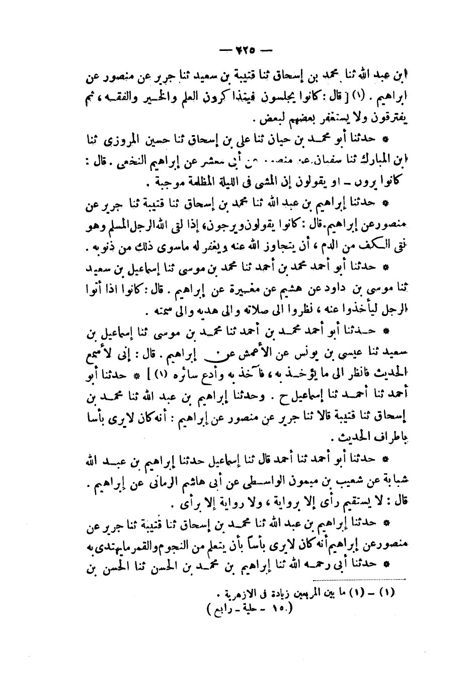 حَدَّثَنَا أَبُو أَحْمَدَ، ثَنَا أَحْمَدُ، ثَنَا إِسْمَاعِيلُ، ح. وَحَدَّثَنَا إِبْرَاهِيمُ بْنُ عَبْدِ اللهِ، ثَنَا مُحَمَّدُ بْنُ إِسْحَاقَ، ثَنَا قُتَيْبَةُ، قَالَا: ثَنَا جَرِيرٌ، عَنْ مَنْصُورٍ، عَنْ إِبْرَاهِيمَ: أَنَّهُ «§كَانَ لَا يَرَى بَأْسًا بِأَطْرَافِ الْحَدِيثِ»