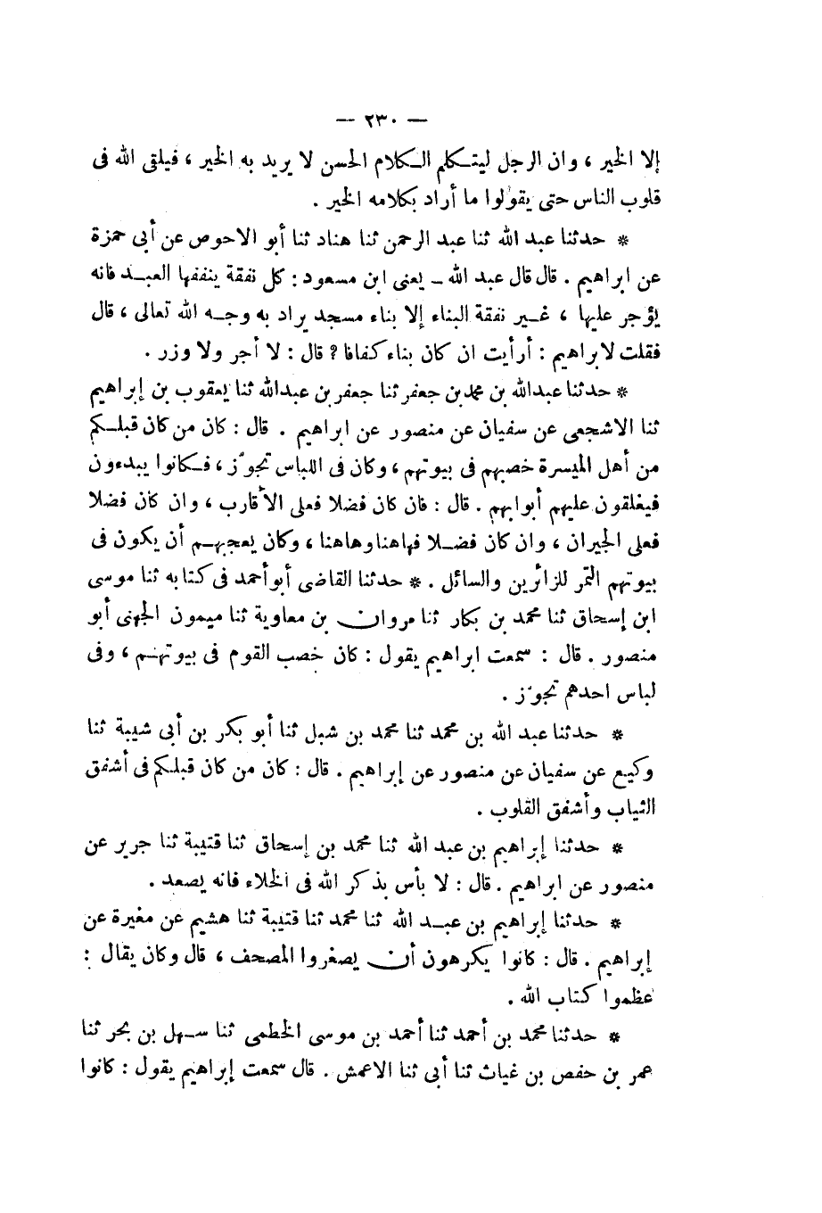 حَدَّثَنَا عَبْدُ اللهِ بْنُ مُحَمَّدٍ، ثَنَا مُحَمَّدُ بْنُ شِبْلٍ، ثَنَا أَبُو بَكْرِ بْنُ أَبِي شَيْبَةَ، ثَنَا وَكِيعٌ، عَنْ سُفْيَانَ، عَنْ مَنْصُورٍ، عَنْ إِبْرَاهِيمَ، قَالَ: «§كَانَ مَنْ كَانَ قَبْلَكُمْ فِي أَشْفَقِ الثِّيَابِ، وَأَشْفَقِ الْقُلُوبِ»