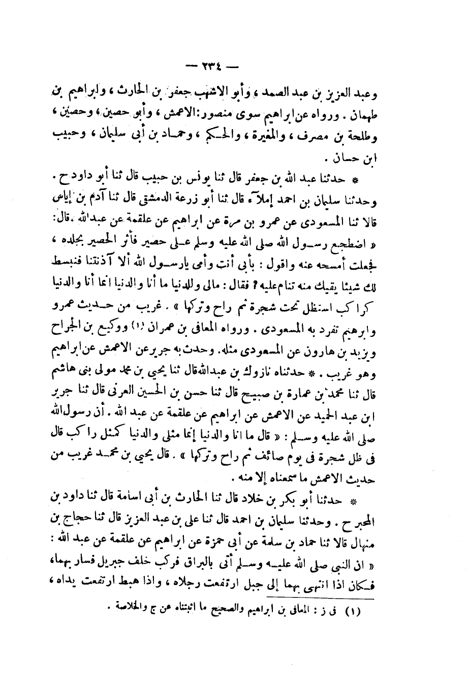 حَدَّثَنَاهُ نَازُوكُ بْنُ عَبْدِ اللهِ، قَالَ: ثَنَا يَحْيَى بْنُ مُحَمَّدٍ مَوْلَى بَنِي هَاشِمٍ، قَالَ: ثَنَا مُحَمَّدُ بْنُ عُمَارَةَ بْنِ صُبَيْحٍ، قَالَ: ثَنَا حَسَنُ بْنُ الْحُسَيْنِ الْعُرَنِيُّ، قَالَ: ثَنَا جَرِيرُ بْنُ عَبْدِ الْحَمِيدِ، عَنِ الْأَعْمَشِ، عَنْ إِبْرَاهِيمَ، عَنْ عَلْقَمَةَ، عَنْ عَبْدِ اللهِ، أَنَّ رَسُولَ اللهِ صَلَّى اللهُ عَلَيْهِ وَسَلَّمَ قَالَ: «مَا أَنَا وَالدُّنْيَا، إِنَّمَا §مَثَلِي وَالدُّنْيَا كَمَثَلِ رَاكِبٍ قَالَ فِي ظِلِّ شَجَرَةٍ فِي يَوْمٍ صَائِفٍ ثُمَّ رَاحَ وَتَرْكَهَا». قَالَ يَحْيَى بْنُ مُحَمَّدٍ: غَرِيبٌ مِنْ حَدِيثِ الْأَعْمَشِ، مَا سَمِعْنَاهُ إِلَّا مِنْهُ