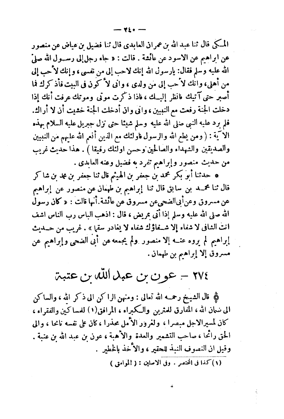 §عَوْنُ بْنُ عَبْدِ اللهِ بْنِ عُتْبَةَ قَالَ الشَّيْخُ رَحِمَهُ اللهُ تَعَالَى: وَمِنْهُمُ الرَّاكِنُ إِلَى ذِكْرِ اللهِ، وَالسَّاكِنُ إِلَى ضَمَانِ اللهِ، الْمُفَارِقُ لِلْمُثْرِينَ وَالْكُبَرَاءِ، الْمُرَافِقُ لِلْمَسَاكِينِ وَالْفُقَرَاءِ، كَانَ لِمَسِيرِ الْأََجَلِ مُبْصِرًا، وَلِغُرُورِ الْأَمَلِ مُحَذِّرًا، كَانَ عَلَى نَفْسِهِ نَائِحًا، وَإِلَى الْحَقِّ رَائِحًا، صَاحِبُ التَّشْمِيرِ وَالْعُدَّةِ وَالْأُهْبَةِ: عَوْنُ بْنُ عَبْدِ اللهِ بْنِ عُتْبَةَ. وَقِيلَ: إِنَّ التَّصَوُّفَ النَّبْذُ لِلْحَقِيرِ، وَالْأَخْذُ بِالْخَطِيرِ
