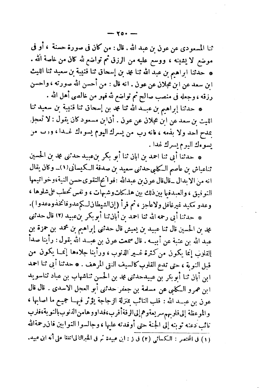 حَدَّثَنَا إِبْرَاهِيمُ بْنُ عَبْدِ اللهِ، ثَنَا مُحَمَّدُ بْنُ إِسْحَاقَ، ثَنَا قُتَيْبَةُ بْنُ سَعِيدٍ، ثَنَا اللَّيْثُ بْنُ سَعْدٍ، عَنِ ابْنِ عَجْلَانَ، عَنْ عَوْنٍ، أَنَّ ابْنَ مَسْعُودٍ كَانَ يَقُولُ: «§لَا تَعْجَلْ بِمَدْحِ أَحَدٍ وَلَا بِذَمِّهِ؛ فَإِنَّهُ رُبَّ مَنْ يَسُرُّكَ الْيَوْمَ يَسُوءُكَ غَدًا، وَرُبَّ مَنْ يَسُوءُكَ الْيَوْمَ يَسُرُّكَ غَدًا»