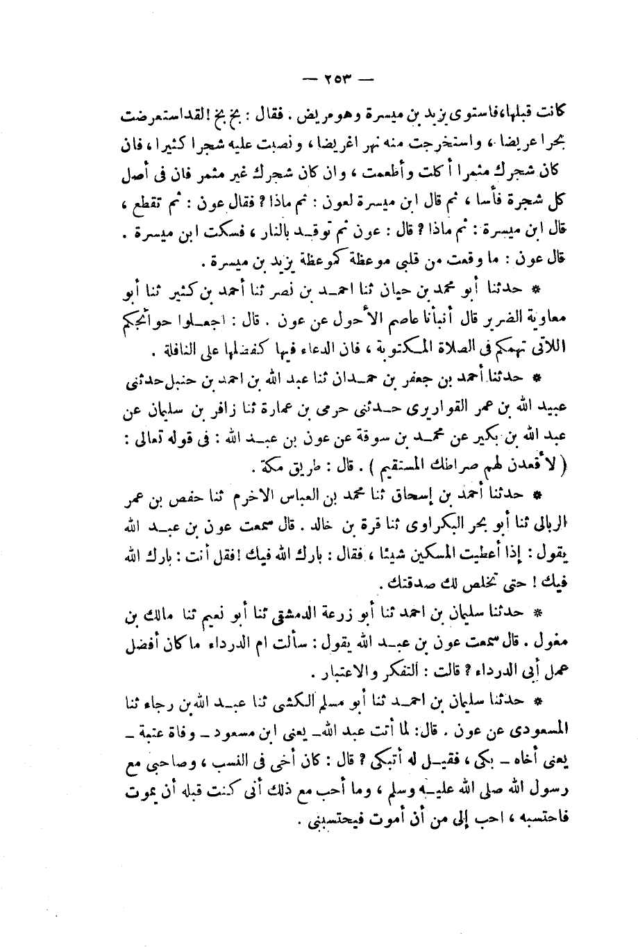 حَدَّثَنَا أَحْمَدُ بْنُ جَعْفَرِ بْنِ حَمْدَانَ، ثَنَا عَبْدُ اللهِ بْنُ أَحْمَدَ بْنِ حَنْبَلٍ، حَدَّثَنِي عُبَيْدُ اللهِ بْنُ عُمَرَ الْقَوَارِيرِيُّ، حَدَّثَنِي حَرَمِيُّ بْنُ عُمَارَةَ، ثَنَا زَافِرُ بْنُ سُلَيْمَانَ، عَنْ عَبْدِ اللهِ بْنِ بُكَيْرٍ، عَنْ مُحَمَّدِ بْنِ سُوقَةَ، عَنْ عَوْنِ بْنِ عَبْدِ اللهِ: فِي قَوْلِهِ تَعَالَى {§لَأَقْعُدَنَّ لَهُمْ صِرَاطَكَ الْمُسْتَقِيمَ} [الأعراف: 16] قَالَ: «طَرِيقُ مَكَّةَ»